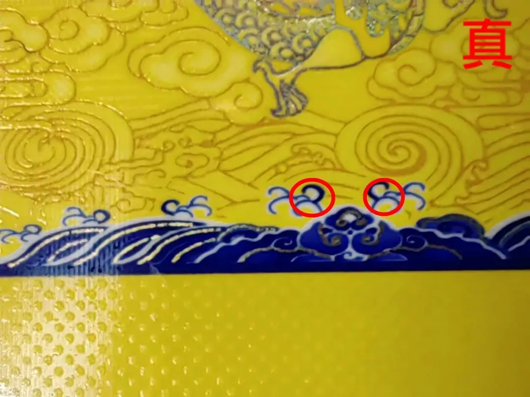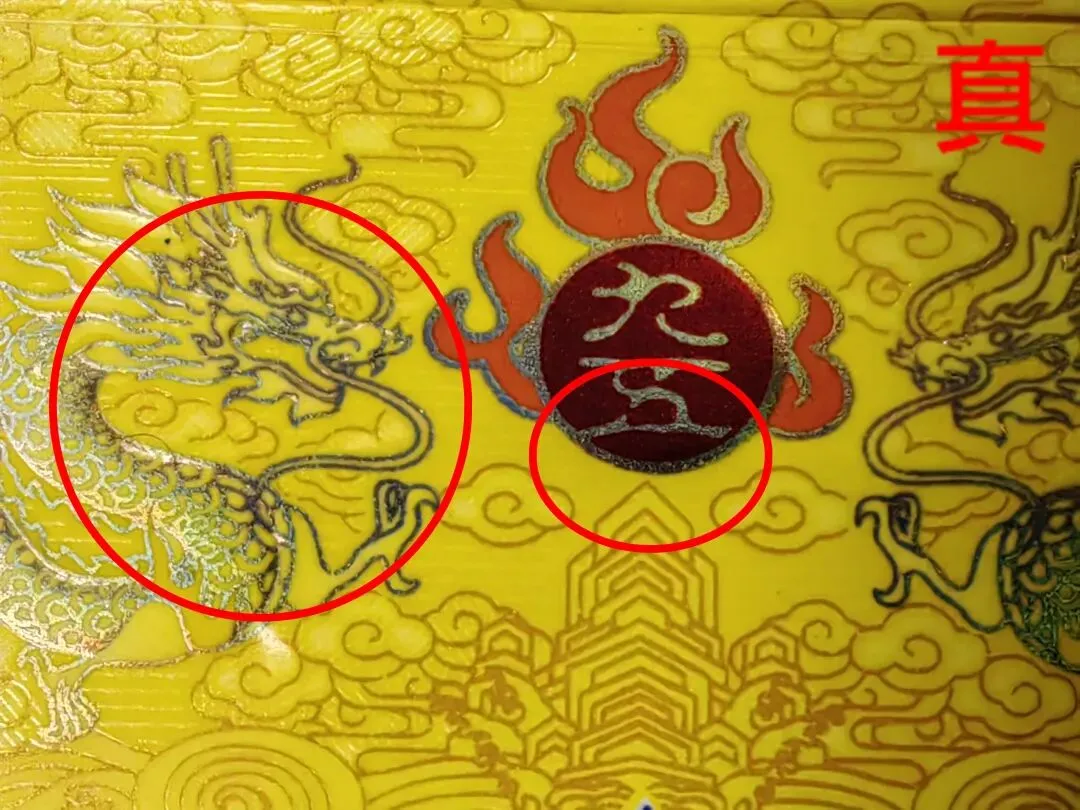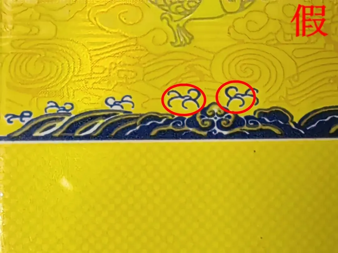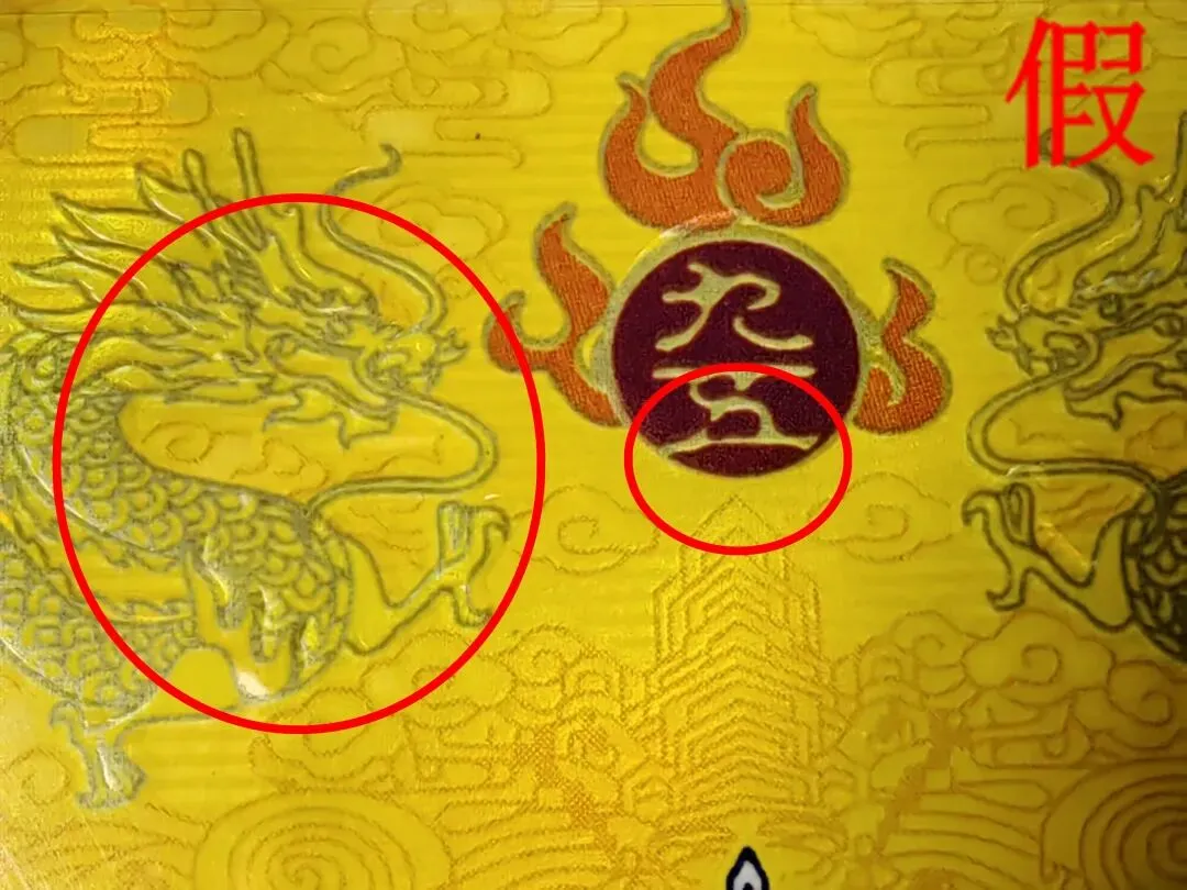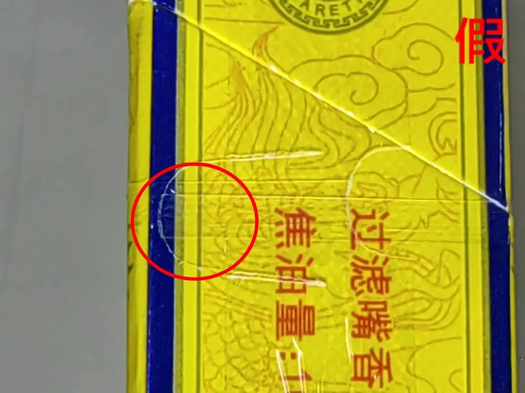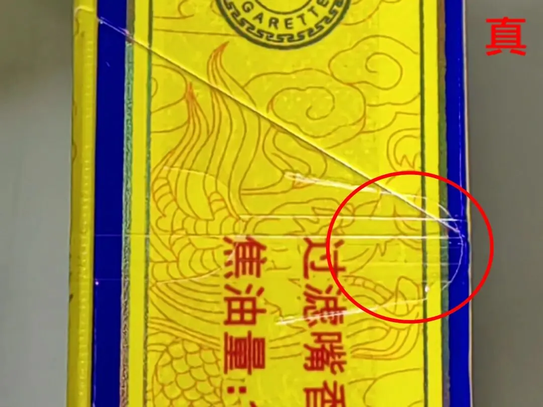 假烟:双龙烫金印刷工艺粗糙、无凹凸感,龙鳞颜色为灰色、火焰珠套印不准。