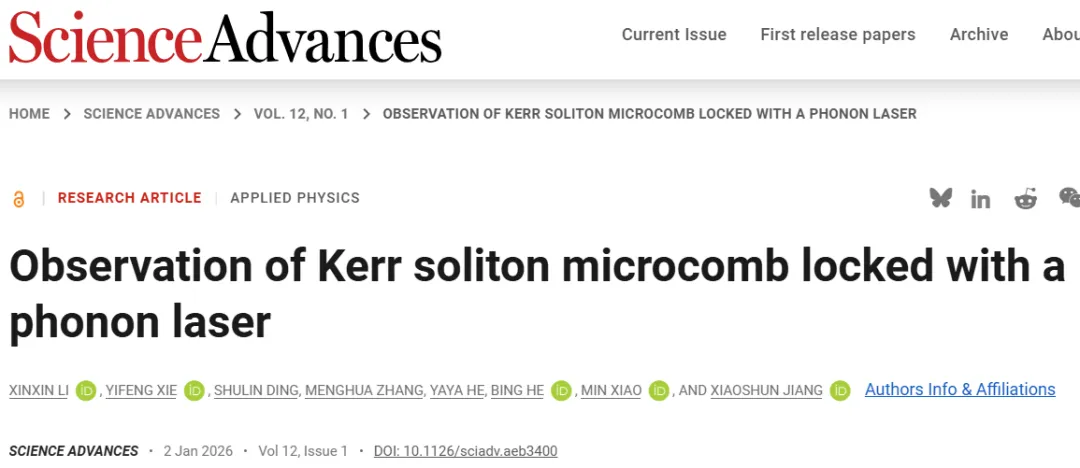 Xinxin Li et al., Observation of Kerr soliton microcomb locked with a phonon laser. Sci. Adv.12, eaeb3400(2026). DOI:10.1126/sciadv.aeb3400