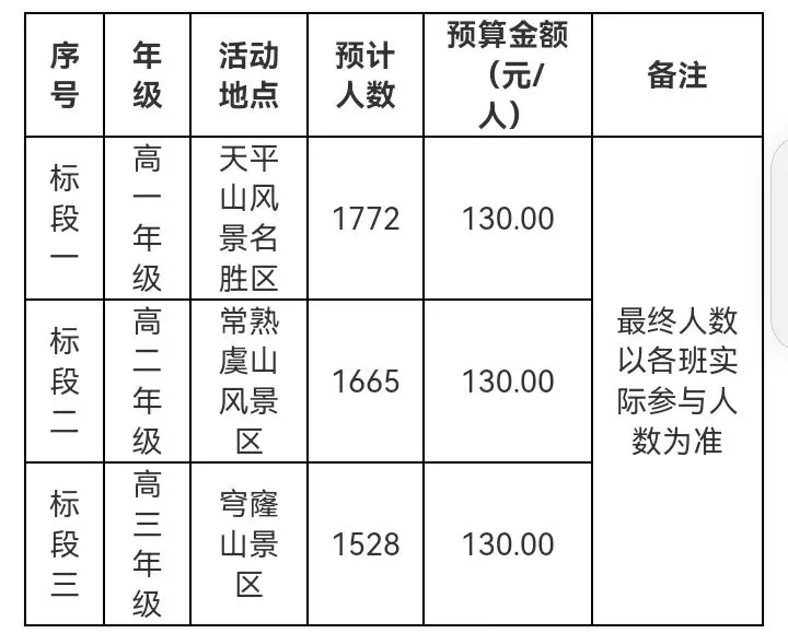 3、预算金额:第一标段:高一年级¥130元/人;第二标段:高二年级¥130元/人;第三标段:高三年级¥130元/人。