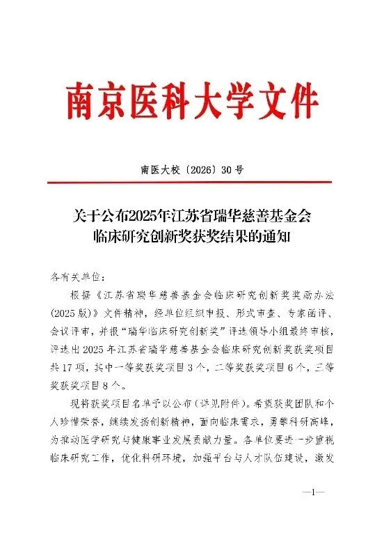 “江苏省瑞华慈善基金会临床研究创新奖”是由江苏省瑞华慈善基金会设立的奖项,主要奖励具有突出贡献的创新性临床研究成果,由瑞华慈善基金会授权委托南京医科大学组织实施,每年吸引了全省众多的医学研究专家踊跃申报。