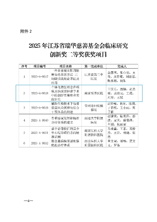 近日,南京医科大学发布《关于公布2025年江苏省瑞华慈善基金会临床研究创新奖获奖结果的通知》,南京医科大学附属明基医院神经外科王汉东教授团队创新项目“个体化微创理念在颅底及脑深部肿瘤手术中的创新性策略和实践研究”荣获二等奖,这是我院在江苏省瑞华医学奖新的收获!