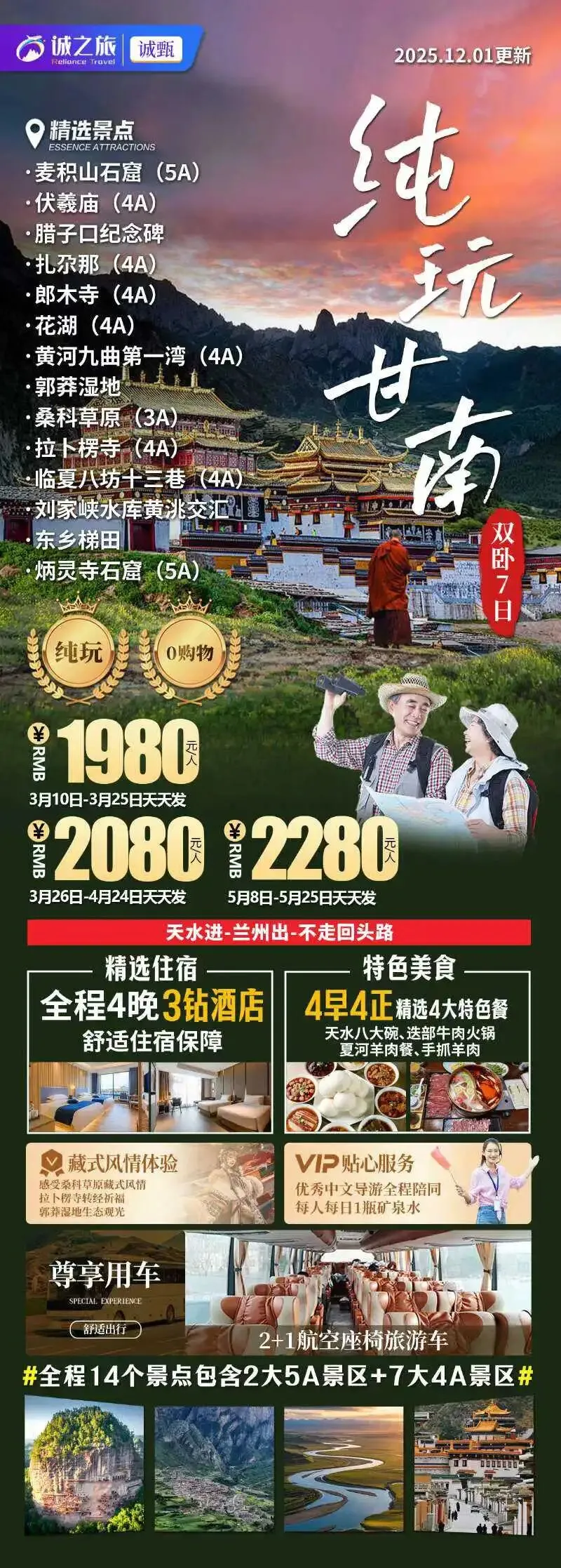 ✅ 麦积山石窟、扎尕那、郎木寺、花湖、黄河九曲第一湾等15+顶流景点全覆盖