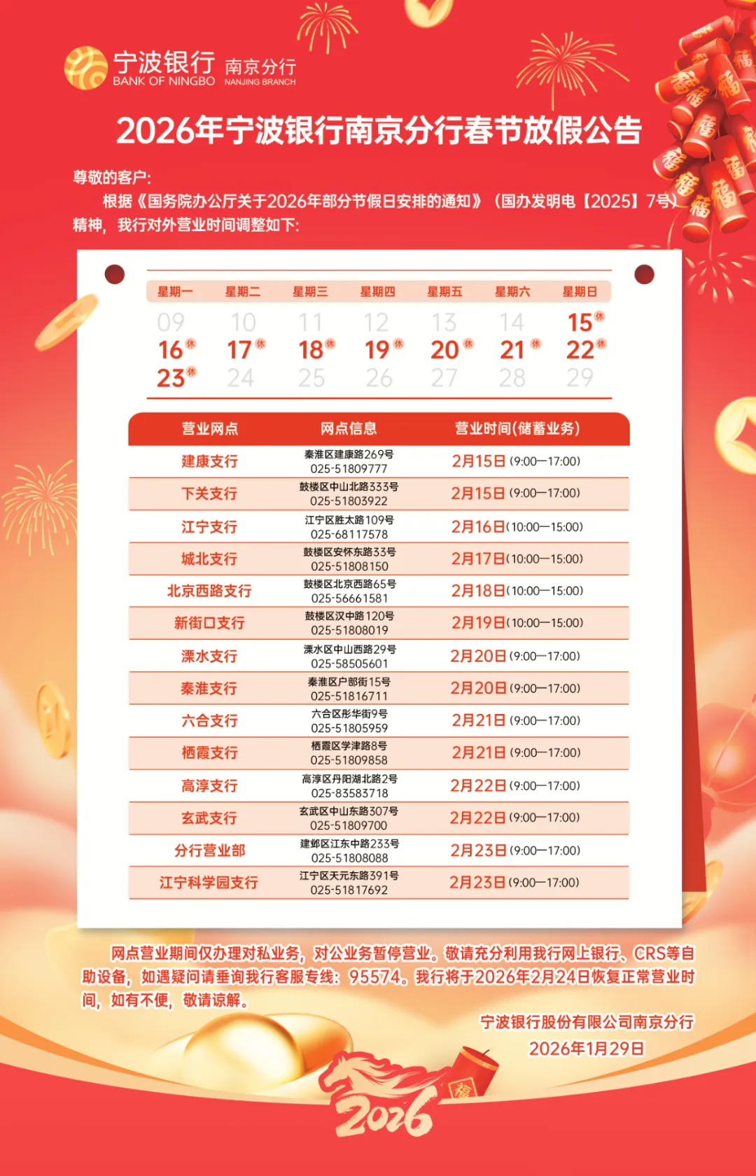 南京银行上海分行关于个人征信自助查询机春节假期服务时间的公告