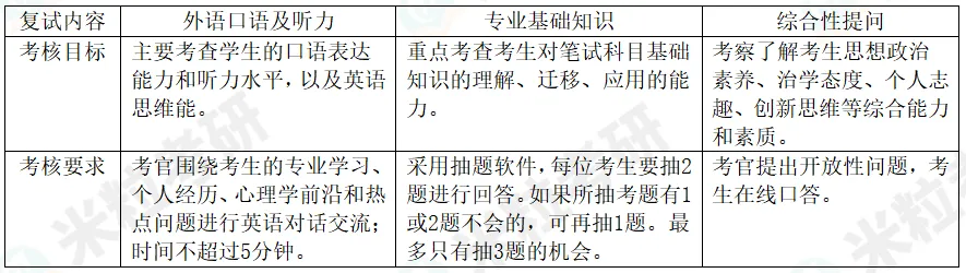 学院成立命题工作组,结合学科专业特点,精心设计复试内容,确保复试考核科学有效、公正公平。复试首先进行信息比及身份验证,考核内容包含英语口语及听力、专业基础知识考核和综合性提问三项内容,具体考核要求如下: