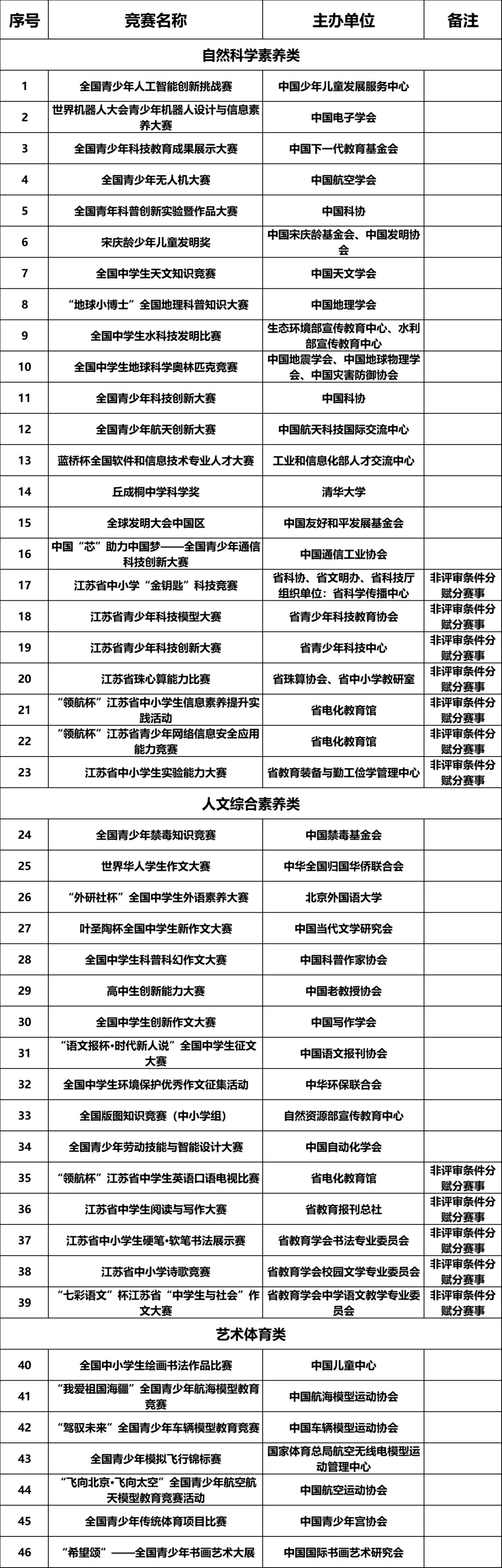 竞赛名单取消:全国中小学信息技术创新与实践大赛、“北斗杯”全国青少年空天科技体验与创新大赛、全国青少年文化遗产知识大赛、全国青少年音乐素养大赛。