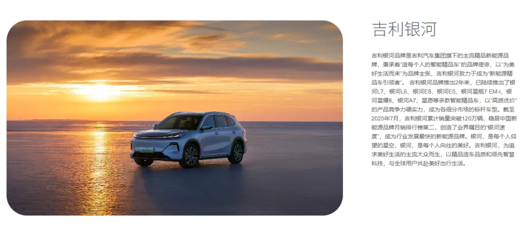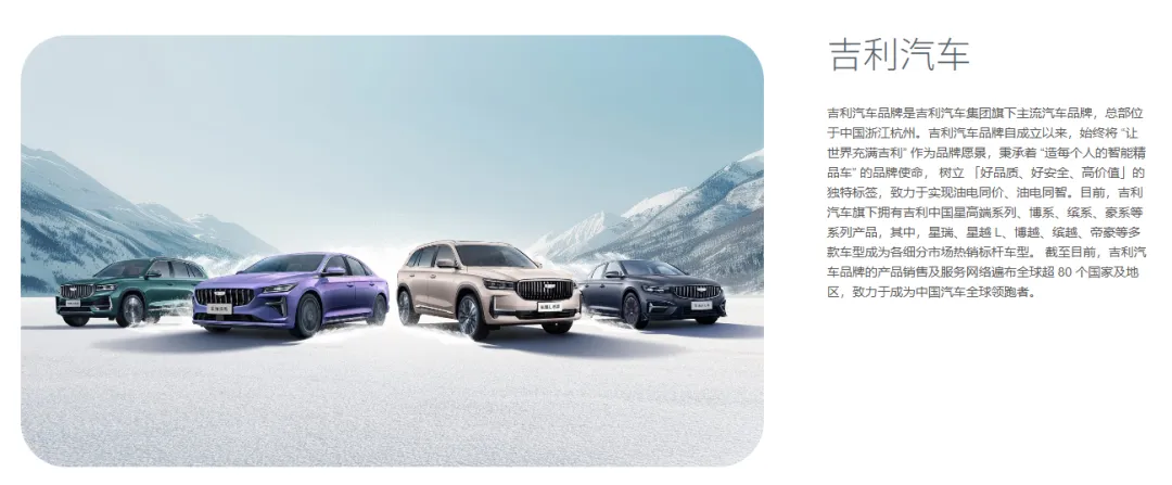 吉利控股集团以“引领绿色智能通行生态”为愿景,致力于以创新的绿色智能科技,为用户提供“可油可电可醇”的卓越产品与灵活能源服务,推进“安全放心、普惠平权”的智能出行与运输解决方案,引领“绿色低碳、智能共享、乘商互联、天地一体”的通行生态。集团业务涵盖汽车及上下游产业链、智能出行服务、绿色运力、醇氢生态、数字科技等;旗下乘用车品牌“吉利、吉利银河、领克、极氪、沃尔沃、极星、莲花”,新能源商用车品牌“远程”等围绕各自品牌定位,依法合规地积极参与全球市场竞争。集团以汽车产业电动化和智能化转型为核心,坚定在新能源科技、三电技术、人机交互、辅助驾驶、车载芯片、低轨卫星等前沿技术领域投入,打造科技护城河,做强科技生态圈,并积极发展新质生产力,持续探索通过绿色甲醇来破解世界能源和双碳难题,积极推进 2045 年实现全产业链碳中和目标。