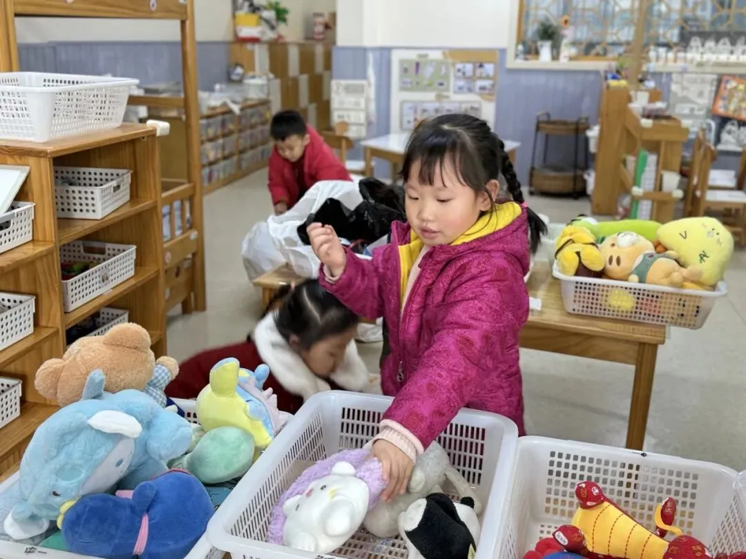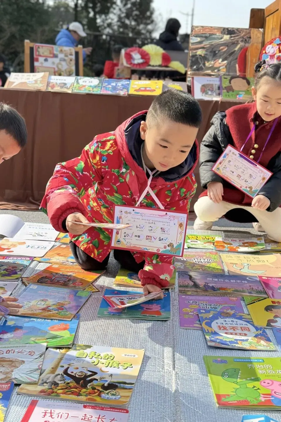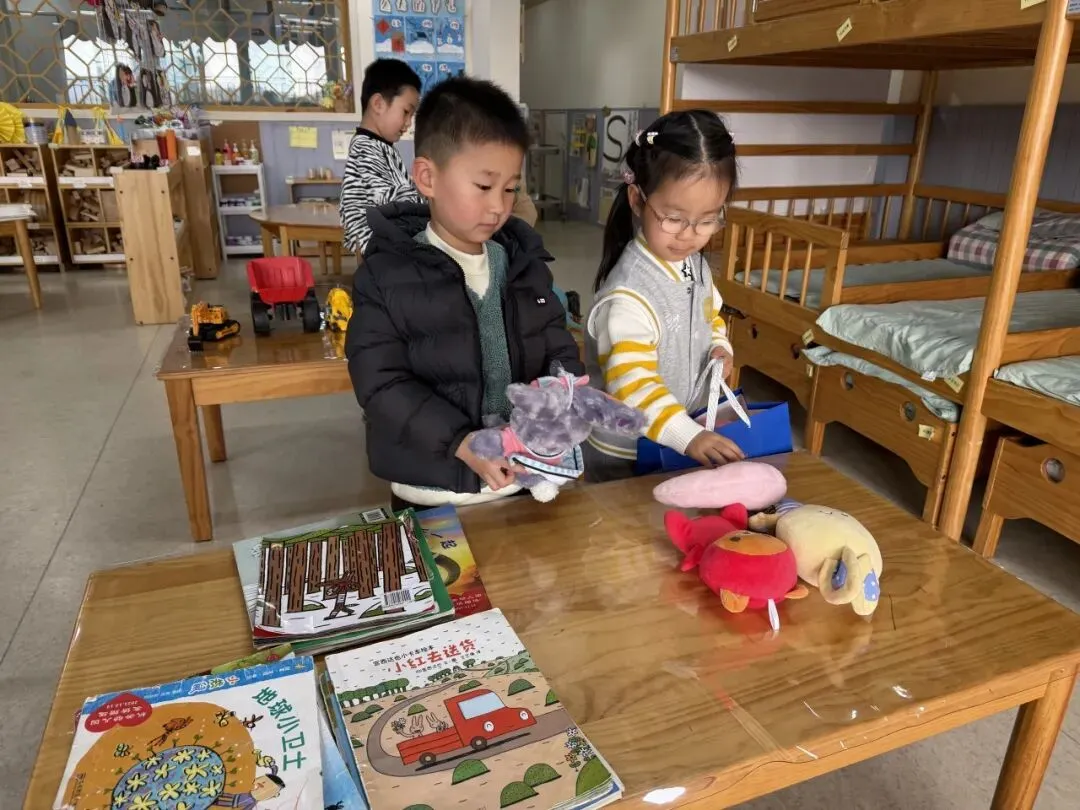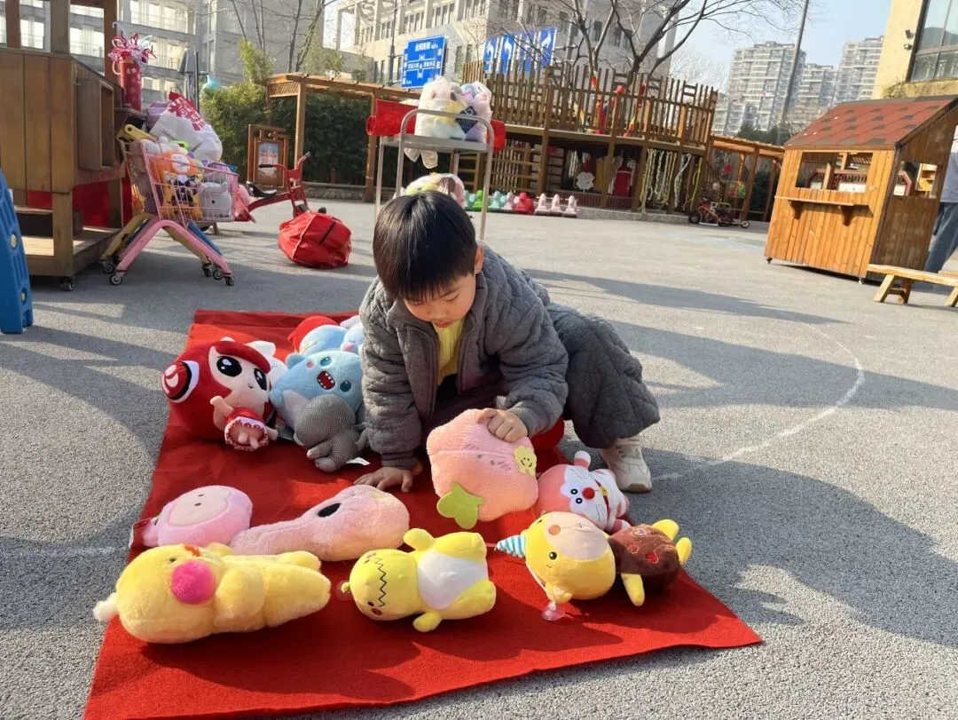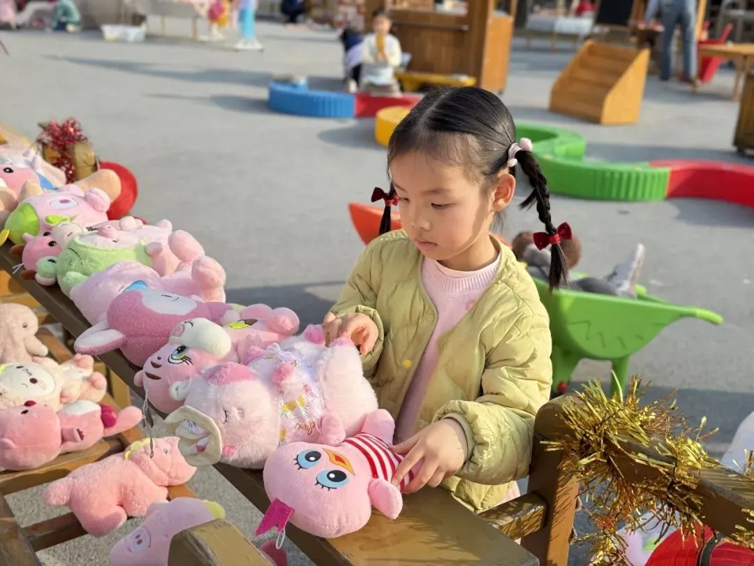 集市一条街里热闹非凡!毛绒玩具被小朋友们团团围住,超受欢迎;绘本区更是吸引了一群小书虫,看得津津有味。