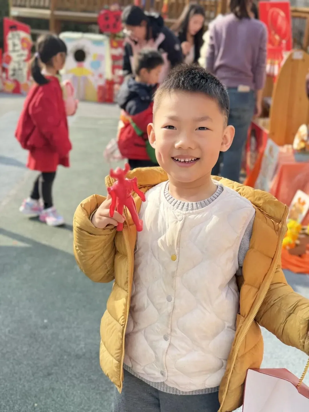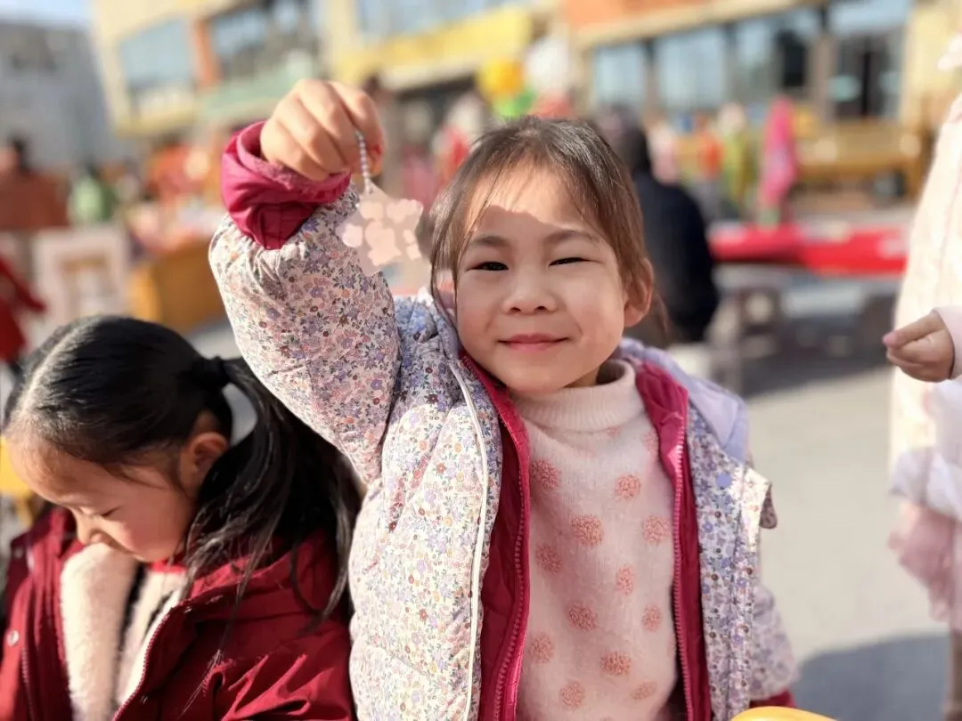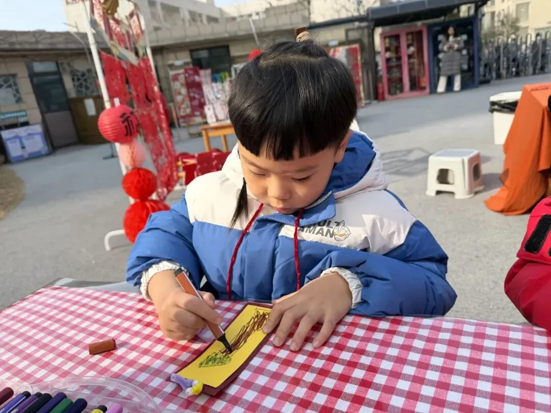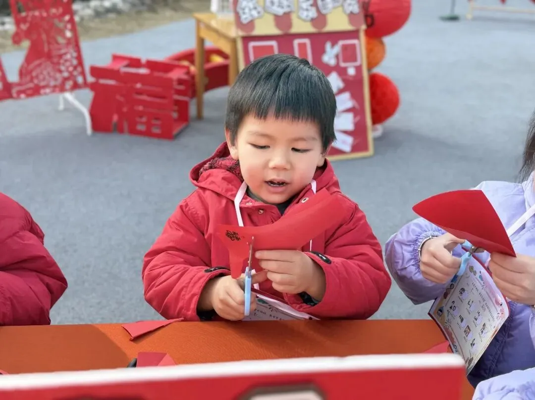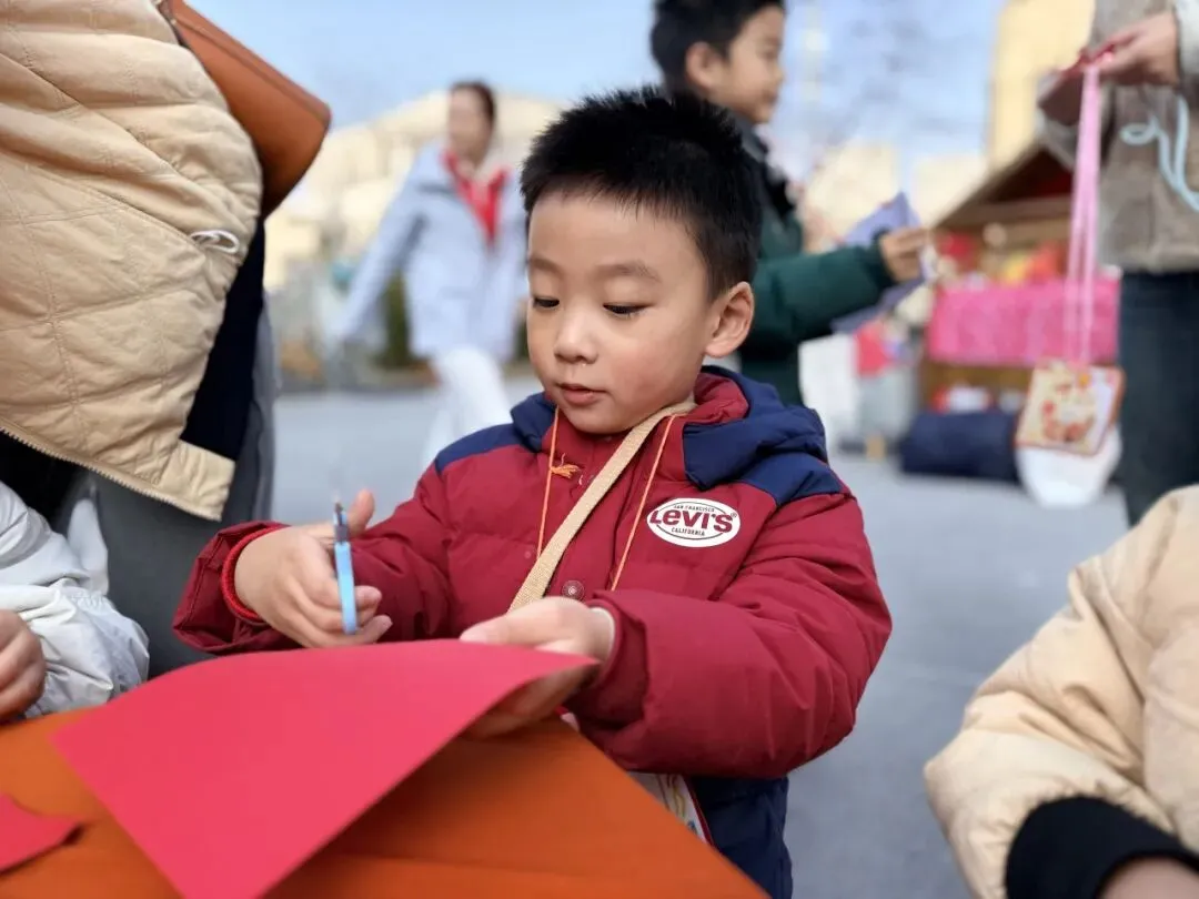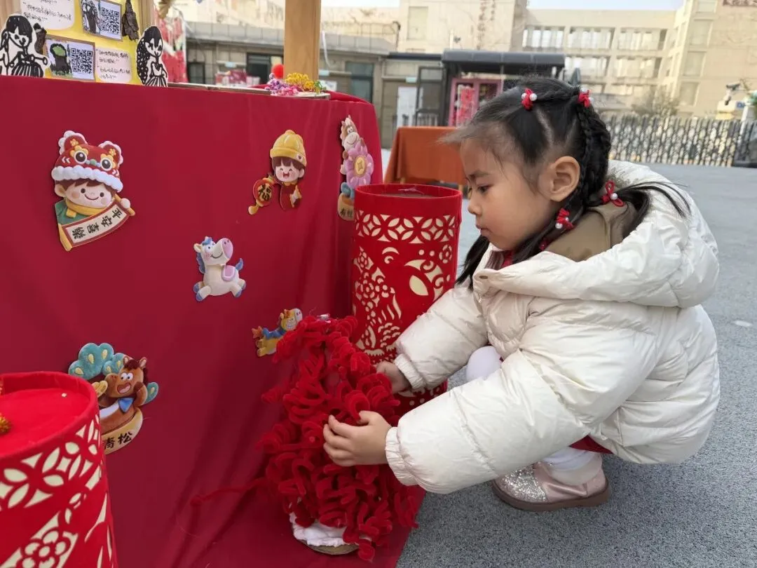 手工一条街里热闹极了!有的孩子捧着红彤彤的福字笑得眉眼弯弯。