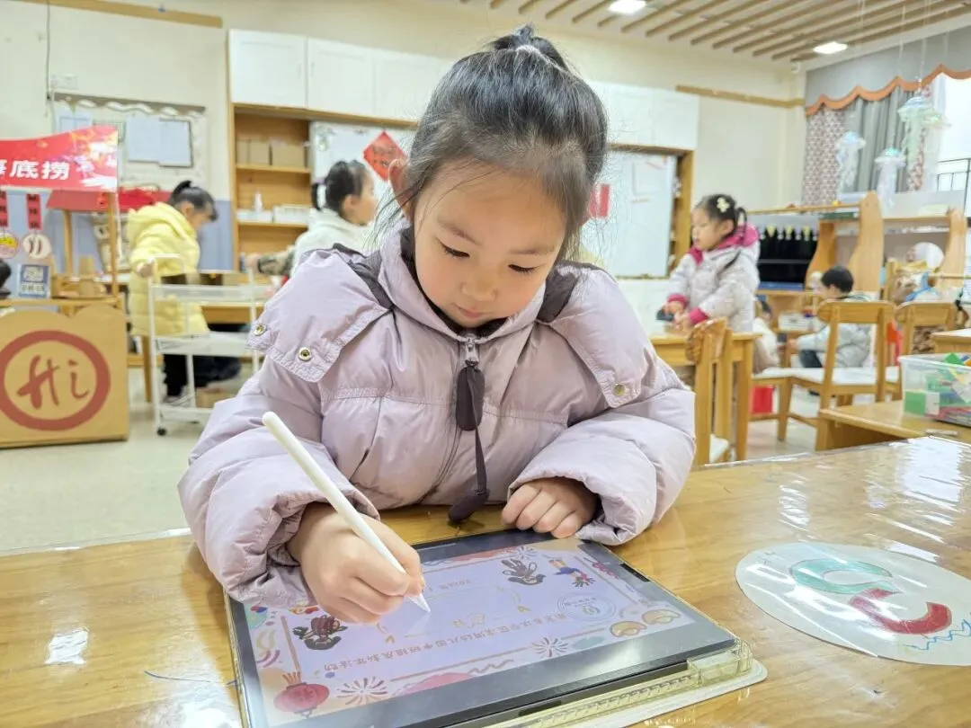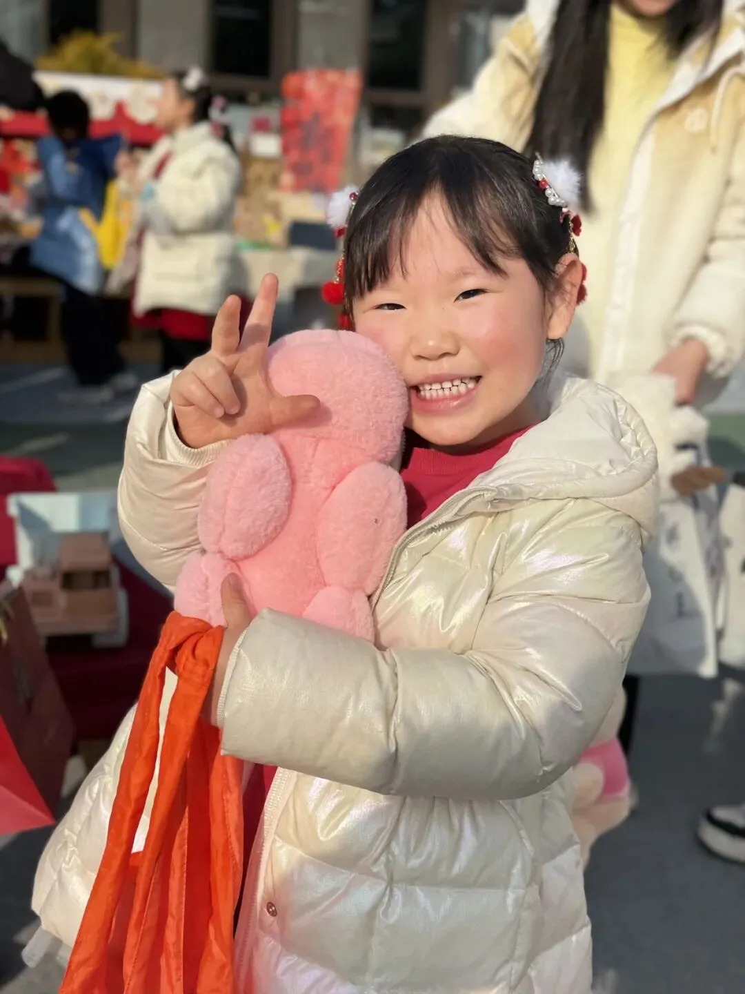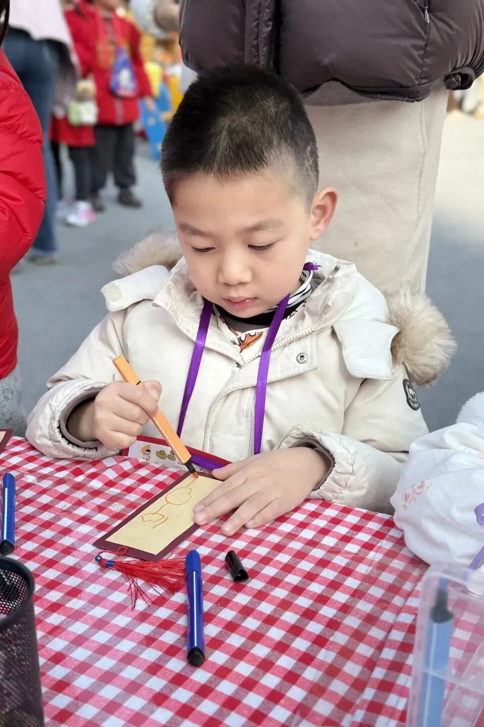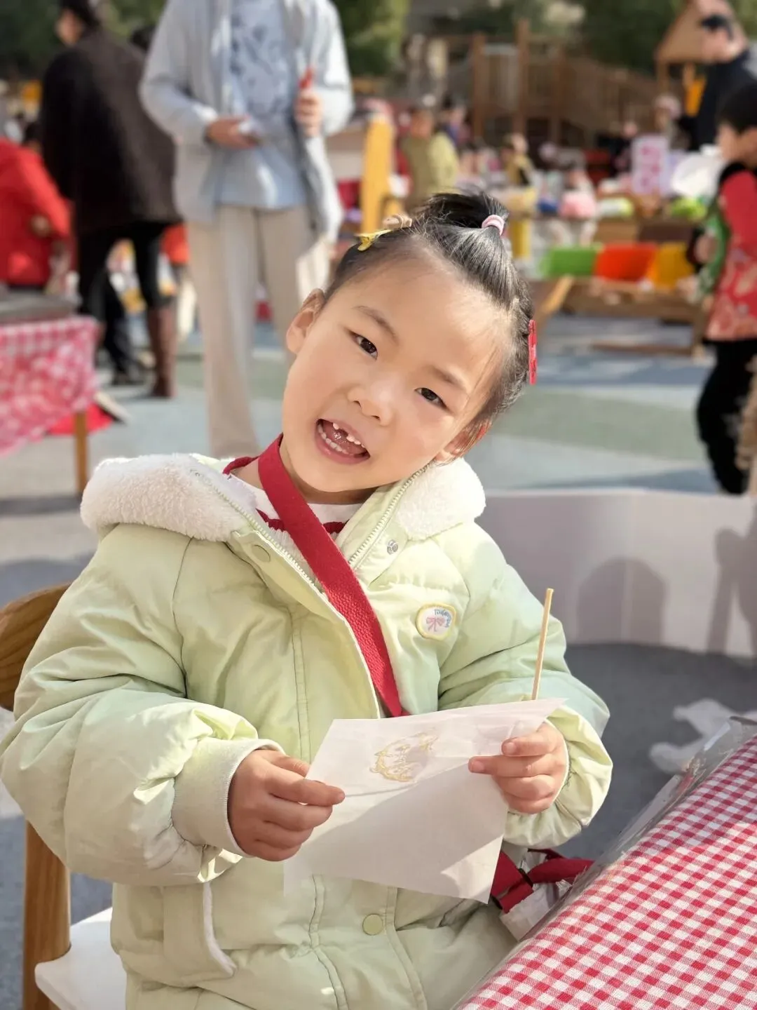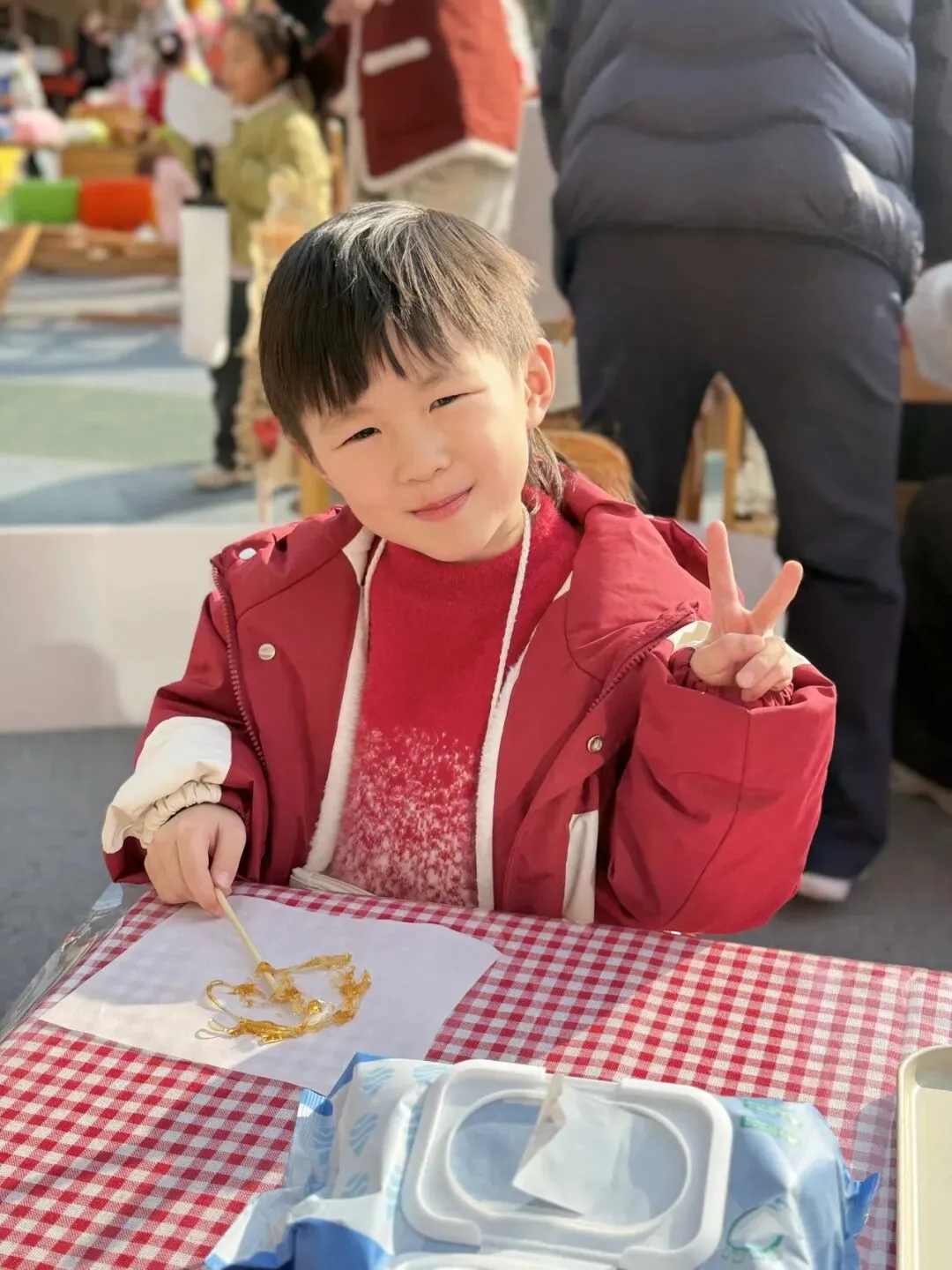 手工一条街里热闹极了!有的孩子捧着红彤彤的福字笑得眉眼弯弯。