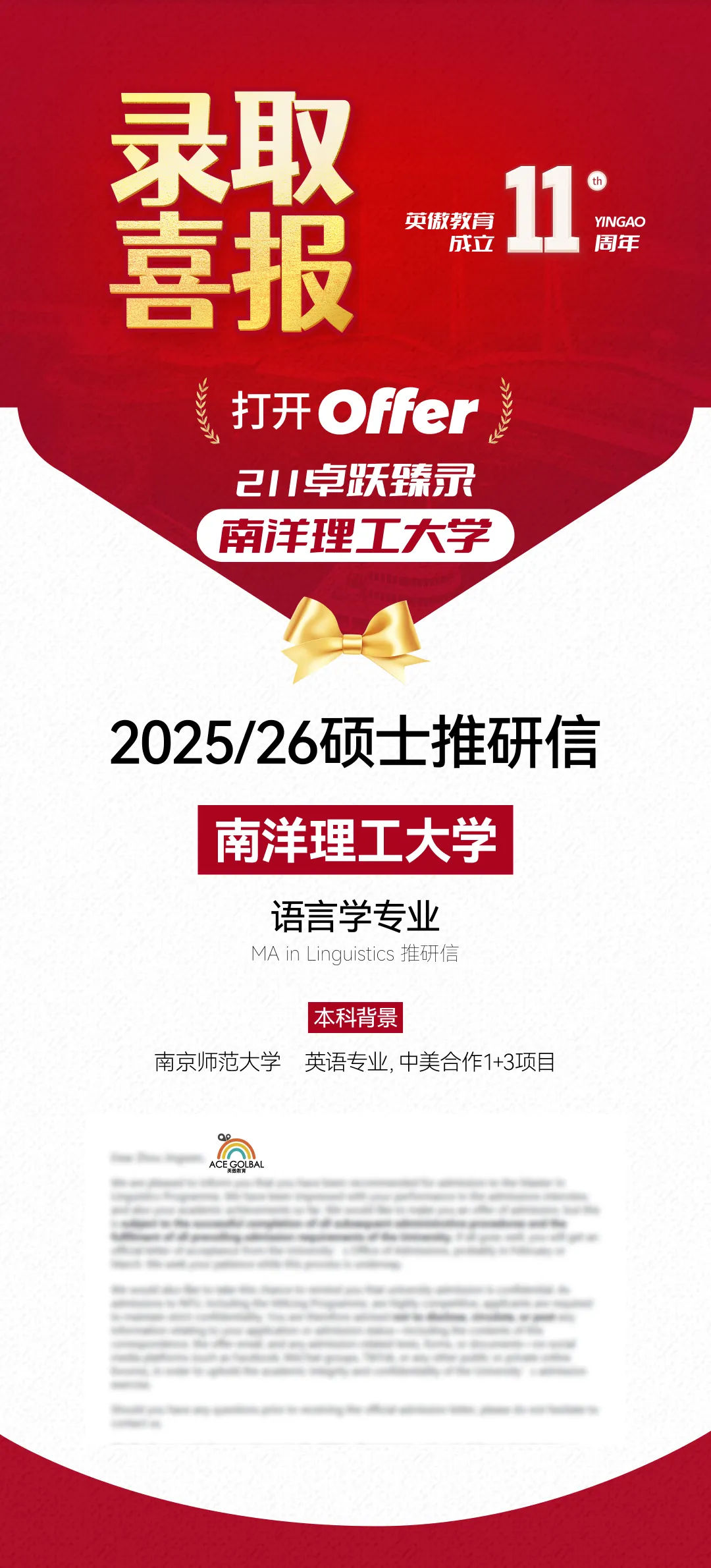 硕士OFFER喜报 | 南京师范大学英专生获南洋理工大学青睐,面试后2周拿到语言学专业推研信!