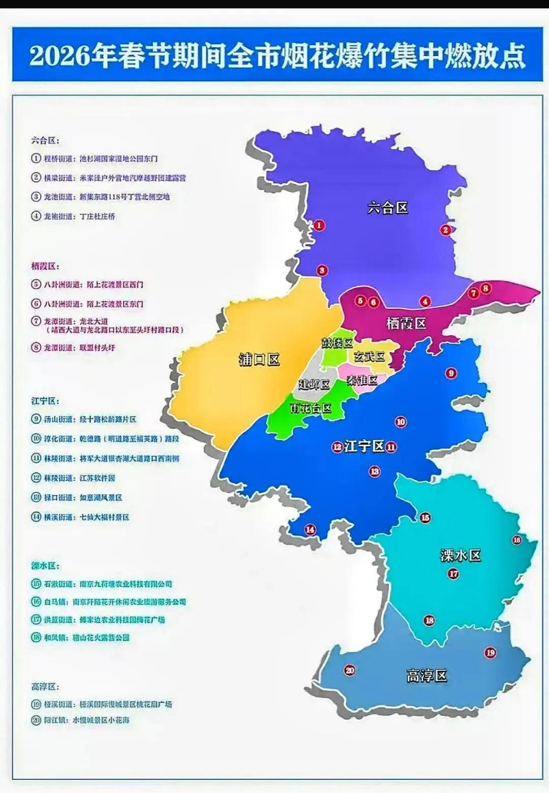 集中燃放点:南京在非禁放区域设置了20个引导性集中燃放点,覆盖六合、栖霞、江宁、溧水、高淳等地,包括湿地公园、景区广场、户外营地等空旷安全区域。