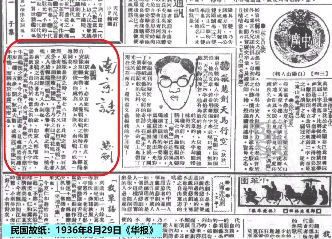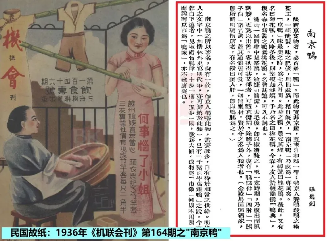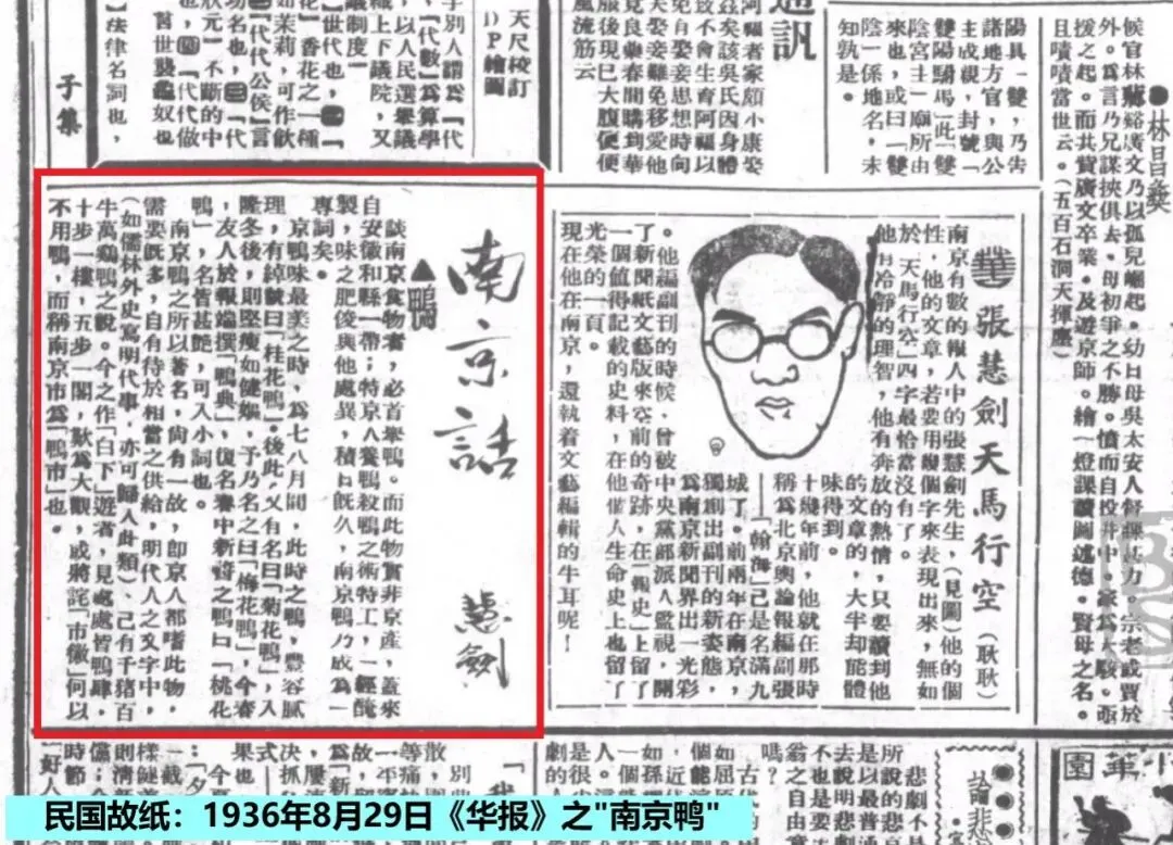 1936年(民国25年)8月29日《华报》以及《机联会刊》第164期等报刊上,刊载有张慧剑作《南京鸭》一文。