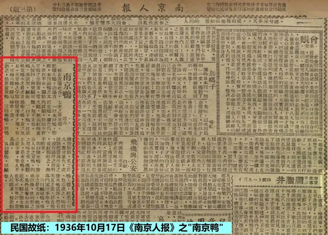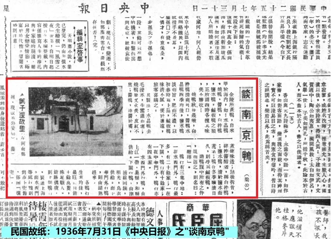 1936年(民国25年)7月31日《中央日报》第三张第一版,刊载署名“梁公”《谈南京鸭》一文,历数“南京鸭”的种类、制法以及鸭行所在地等。其中云: