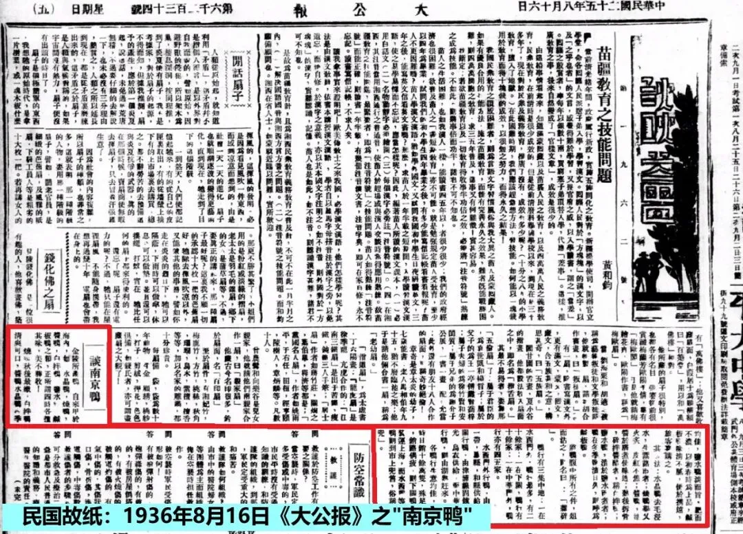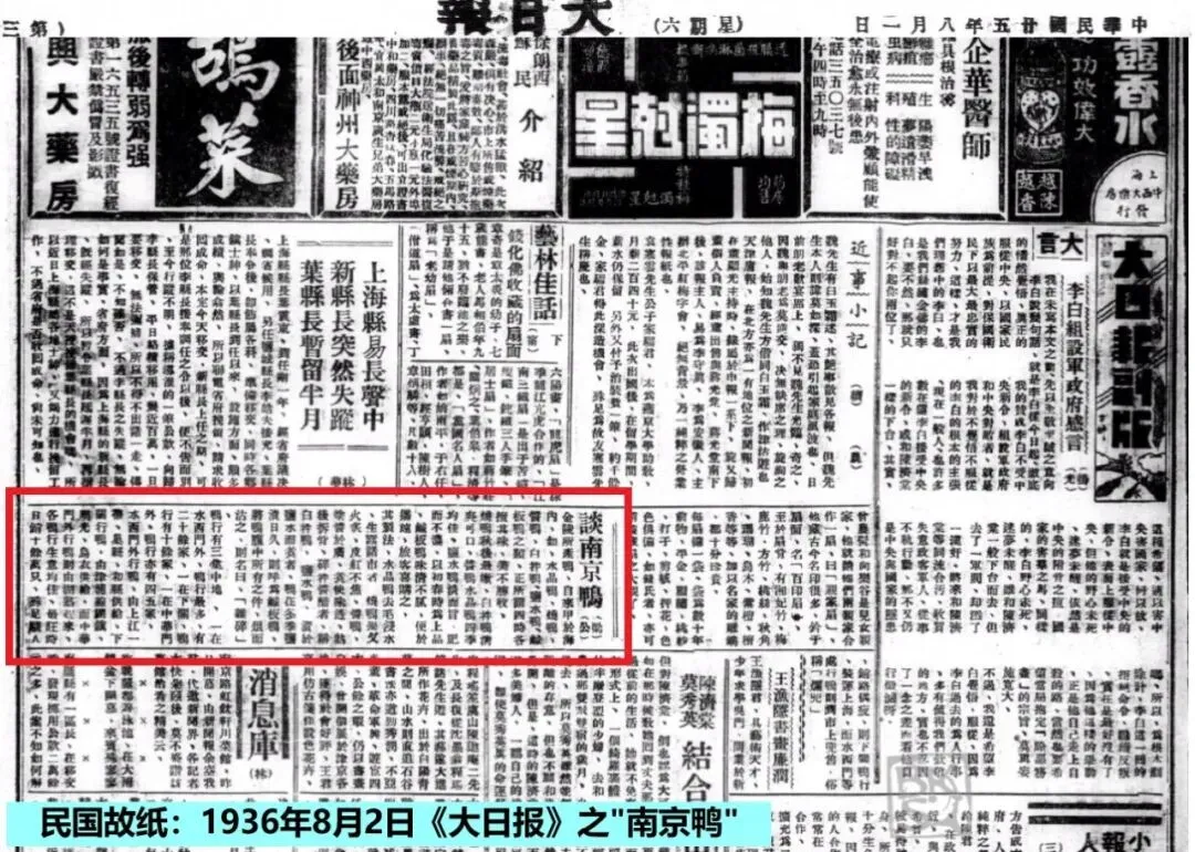 以“南京鸭”为题的文章,民国时期的报刊上时有刊载,其中署名“梁公”的《谈南京鸭》一文,1936年7月31日《中央日报》,1936年8月2日《大日报》,1936年8月3日《世界晚报》,1936年8月16日《大公报》等均有刊载。