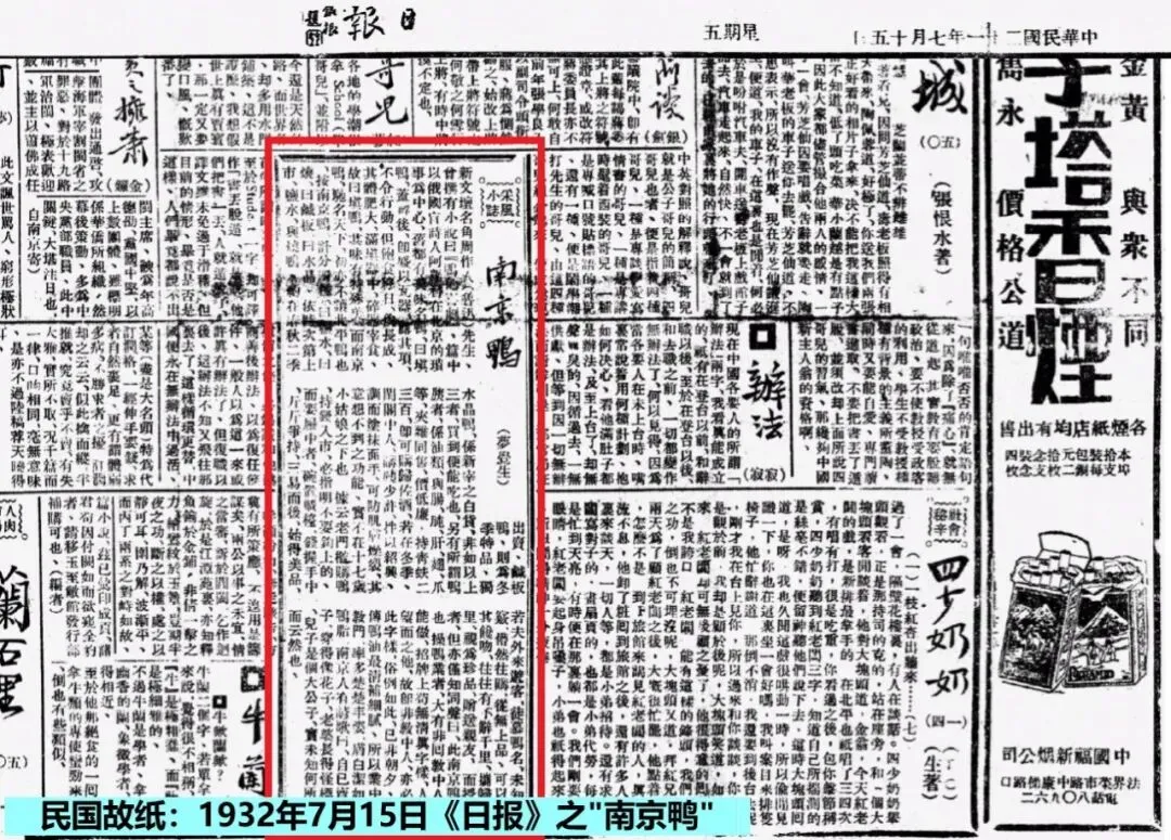 1932年(民国21年)7月15日《日报》“采风小志”栏目,刊载署名“夢觉生”的《南京鸭》一文,从鲁迅先生的小说《鸭的喜剧》谈起,笑谈南京当地的谚歌,“自己卖鸭子,穿得像花子,老婆长得怪标致,儿子是个大公子”。文中云: