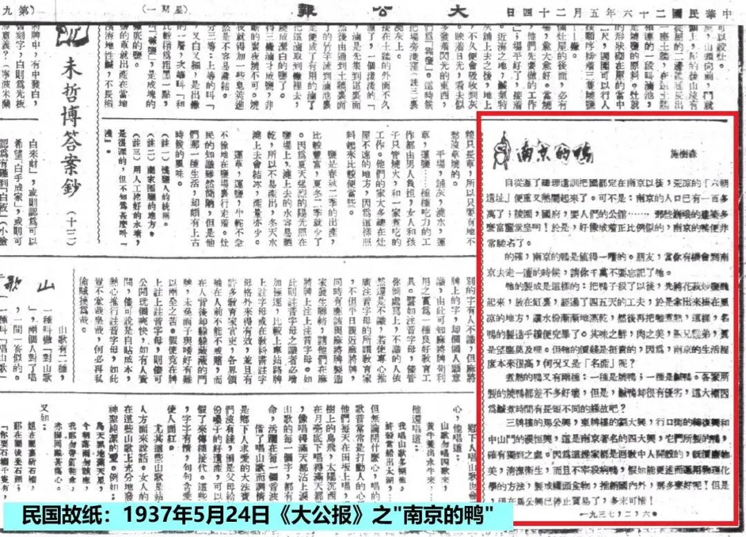 1937年(民国26年)5月24日《大公报》第九版,刊载署名“施树森”的《南京的鸭》一文,战争临近南京,有的鸭铺已经关门了。文中云: