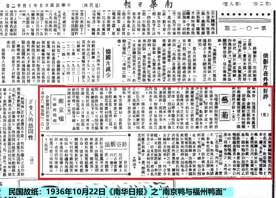 1936年(民国25年)10月22日《南华日报》第二张第八版,刊载了署名“醉汉”的文章《南京鸭与福州鸭面》,其中云,“余前读慧剑君南京话,其中有《南京鸭》一段,述及南京鹹鸭酱鸭围海内有名食味,南京鸭店,十步一楼,五步一阁,价廉物美,堪称上乘云云。读之不觉垂涎三尺,盖素性嗜鸭,几有不能一日无此君也,闽中鸭店以鼓楼前之苏苏酱鸭,兴仓前桥之阿唤鸭面为著名。余就学白水时,阿唤鸭面,日必一尝,同学皆知之,共呼为‘鸭面’,转瞬之间,芳名鹊噪,内外上下无不知也,相见必以此为谑,余亦笑颔之。及读《南京鸭》后,朝夕寻思未知何日可到白下城一饱口福也。此次到京,行装甫卸,饥肠辘辘,急唤茶房购酱鸭两角汤面一碗食之,此时实未暇辨其滋味也。其后屡尝之,深觉此间鸭肉较之福州为丰肥,确属尤物,惟烹饪之功,实不及福州之物美。一昨之夕,同乡招饮其家,清炖肥鸭一尾,丰油肥腻,对月举杯,倍见甘旨,若以名手烹之,更未知何似矣,何处重起易牙一为‘醉汉’烹尽‘南京鸭’也。”
