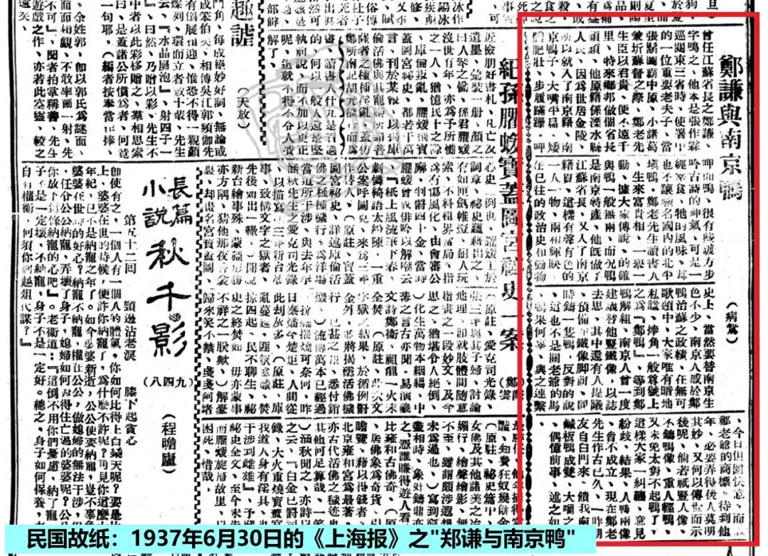 鸭味甘美,鸭子或亦乃“尤物”,也有人将“鸭”来戏谑官员。1937年(民国26年)6月30日的《上海报》,便有一篇题为《郑谦与南京鸭》的文章,讲述了民国时期南京的一件轶事,将曾任江苏省长的郑谦(1876年至1929年,1925年时,曾任江苏省长兼军务督办,实任八个月),称之为“郑鸭”。文章中称,“南京鸭子,大嘴平扁,矮体肥壮,步履蹒跚,呷呷而鸣,很有些踱方步吟古诗的神气,可是一经宰食,牠的风味,却也不让驰名国内的北平填鸭”,而“郑老先生臣以君贵,便不远千里,特来乡邦做个省长顽顽,他原籍系溧水县人氏,因为世居金陵,所以就入了南京籍。郑老先生读书人,生来富贵相,一举一动,据大家传说,的确与鸭一般无两”。