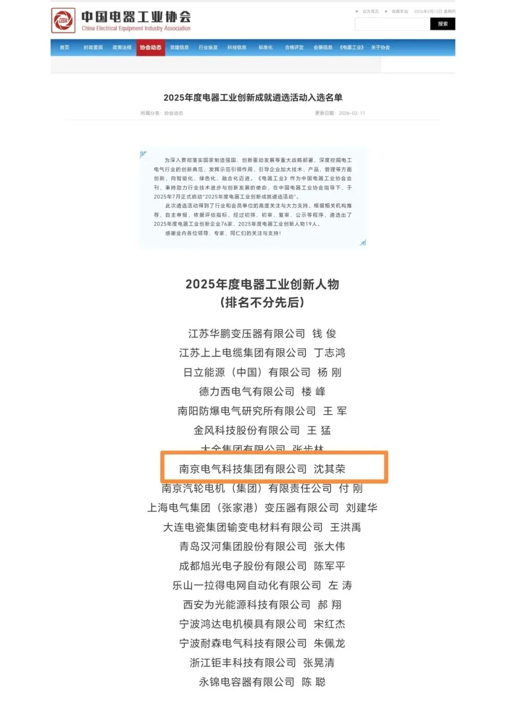 近日,中国电器工业协会正式公布“2025年度电器工业创新成就遴选活动”结果,南京电气科技集团有限公司总经理沈其荣凭借在电工电气领域深耕多年的创新实践、卓越的行业影响力及对产业高质量发展的突出贡献,获评2025年度电器工业创新人物,成为行业创新发展的标杆人物之一。
