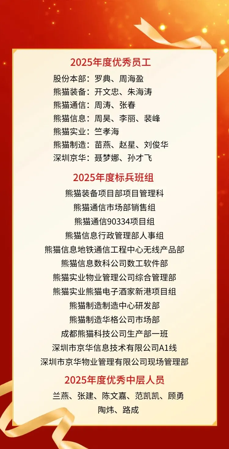 2月12日,南京熊猫电子股份有限公司召开2025年度总结表彰大会,回顾过去一年的改革历程,总结成绩,表彰在推进公司改革发展工作中业绩优秀、贡献突出的先进集体和个人,号召全体干部员工以先进典型为榜样,在共同谱写南京熊猫高质量发展的崭新篇章中奋力拼搏,奋进实干。公司总经理、党委副书记胡回春致新春贺词,党委书记易国富宣读《关于表彰2025年度先进集体和先进个人的决定》,领导班子成员出席会议并为受表彰的先进颁发证书。