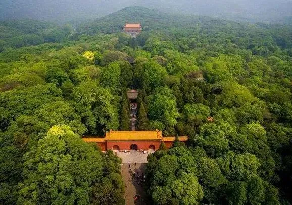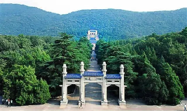 中山陵位于江苏省南京市玄武区紫金山南麓钟山风景区内,前临平川,背拥青嶂,东毗灵谷寺,西邻明孝陵,整个建筑群依山势而建,由南往北沿中轴线逐渐升高,主要建筑有博爱坊、墓道、陵门、石阶、碑亭、祭堂和墓室等,排列在一条中轴线上,体现了中国传统建筑的风格,从空中往下看,像一座平卧在绿绒毯上的“自由钟”。融汇中国古代与西方建筑之精华,庄严简朴,别创新格。