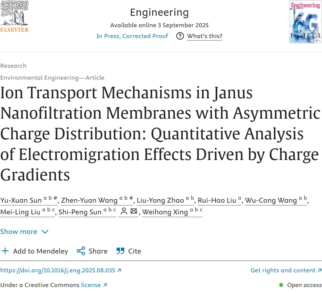 相关研究成果以“Ion Transport Mechanisms in Janus Nanofiltration Membranes with Asymmetric Charge Distribution: Quantitative Analysis of Electromigration Effects Driven by Charge Gradients”为题发表在Engineering上。该文章通讯单位为南京工业大学,共同第一作者为孙宇轩博士研究生和王振远助理教授,通讯作者为孙世鹏教授(ssp@njtech.edu.cn)。