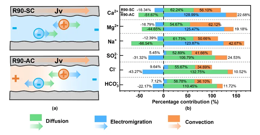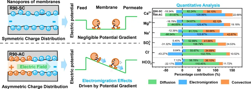 随着全球干旱半干旱地区淡水资源的日益紧张,苦咸水淡化与资源回收技术成为解决农业、饮用水和生态安全的关键。在众多水淡化技术中,纳滤(Nanofiltration, NF)技术因其高效分离和低能耗优势备受关注。近年来,具有非对称电荷分布的Janus纳滤膜因其在离子选择性分离中的优异表现,在水处理和离子资源化等方面展现出巨大应用潜力。然而, Janus膜中离子传输机制的研究目前仍大量停留在定性推测,缺乏关于轴向电荷异质性对离子传输影响的定量探究以及相应的数学模型,在一定程度上限制了其进一步优化与应用。