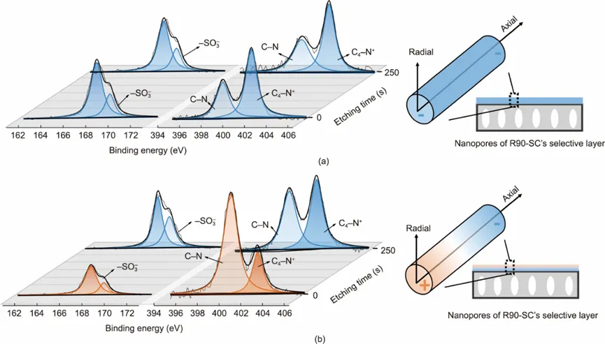 针对这一挑战,南京工业大学孙世鹏教授团队构建了具有轴向电荷分布的Janus膜离子传输模型, Axial charge distributed Donnan Steric Pore Model with Dielectric Exclusio模型,能够精确描述Janus膜离子传输行为的数学模型,揭示了轴向电荷分布产生的本征电场对离子传输的特异性影响(图1)。研究了南京蔚华膜科技有限公司的负电荷中空纤维纳滤膜(R90-SC)和正-负电荷梯度结构的Janus膜(R90-AC),通过深度剖析XPS与Zeta电位等手段验证了其非对称结构(图2)。