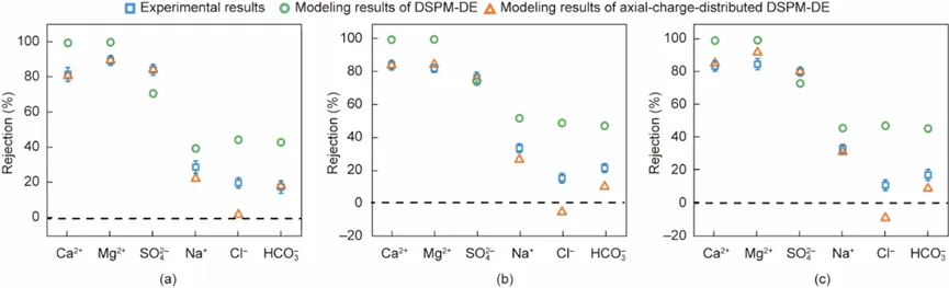 通过将DSPM-DE模型中的电荷密度参数(cq)修正为随膜孔轴向位置(x)变化的电荷密度分布函数(c'q(x)),实现了对于电荷不均匀分布纳滤膜传质行为的理论描述与预测,为电荷结构对离子传输行为影响的定量分析提供了理论工具。在模拟苦咸水体系中(含Na⁺、Ca²⁺、Mg²⁺、Cl⁻、HCO₃⁻、SO₄²⁻等六种离子),引入轴向电荷分布的DSPM-DE模型对六种离子的预测偏差均低于8%,优于传统模型(平均偏差>16%),显著提升了模型在复杂体系中对Janus纳滤膜分离效果的预测精度(图3)。