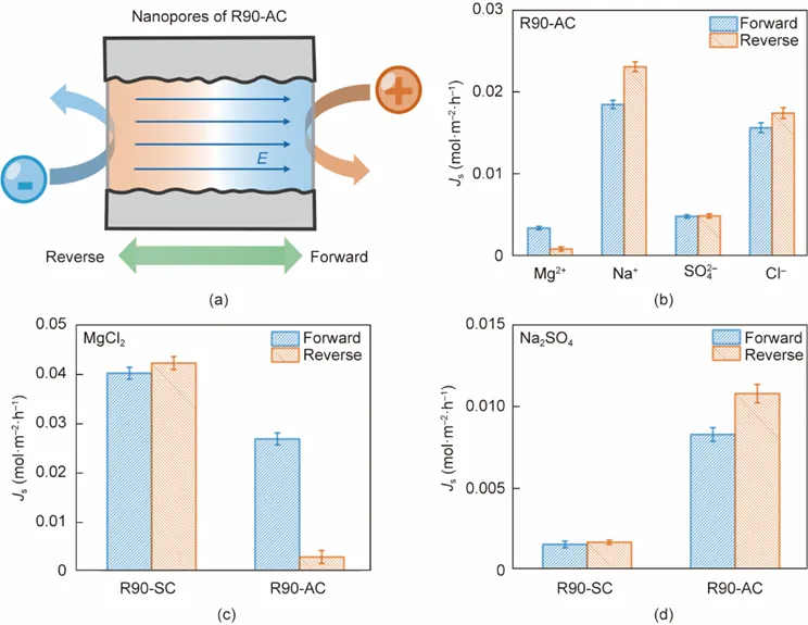 图5 (a) 膜孔内部本征电场产生的离子“静电拖拽”效应示意图;(b)混盐体系下R90-AC膜的正向与反向离子通量;对(c)MgCl₂和(d)Na₂SO₄的正向和反向离子通量