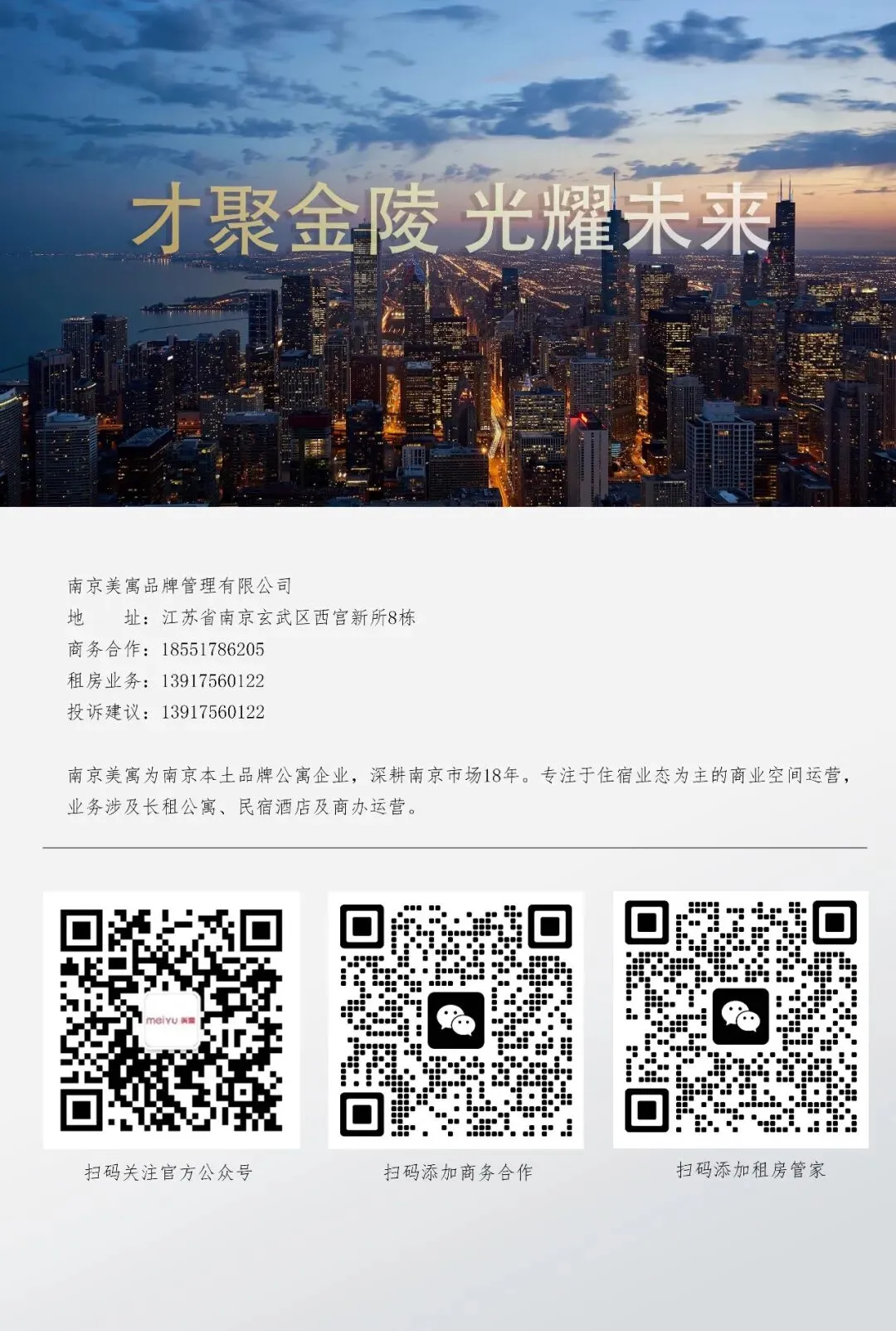 南京美寓品牌管理有限公司为南京本土品牌公寓企业,深耕南京市场18年。分长租、民宿酒店及商办三个事业部,业务涉及:集中式/分散式长租公寓运营(高端整租、普通合租、青年公寓、白领公寓、蓝领公寓、考研公寓),酒店,民宿,商业空间运营。