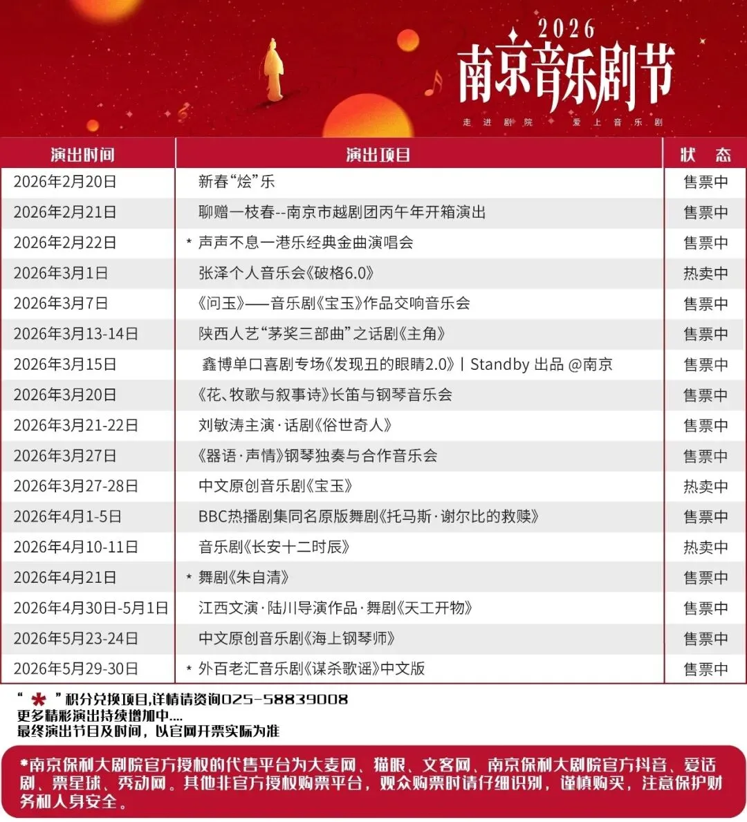 3.本场演出参与会员积分兑换,限南京保利大剧院售票厅办理;