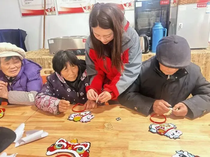 紧接着,记者来到邢丰村居家养老服务中心。这里的活动主题是迎新春剪纸。活动室同样暖意融融,桌上铺满了鲜艳的红纸,剪刀、铅笔、样图等工具一应俱全。七八位老人正低头专注于手中的方寸红纸,剪刀刃口在纸上灵巧地游走,发出细碎而规律的“沙沙”声,如同春蚕食叶。社工小童正半蹲在一位老人身边,手把手地指导着折叠和下剪的角度。