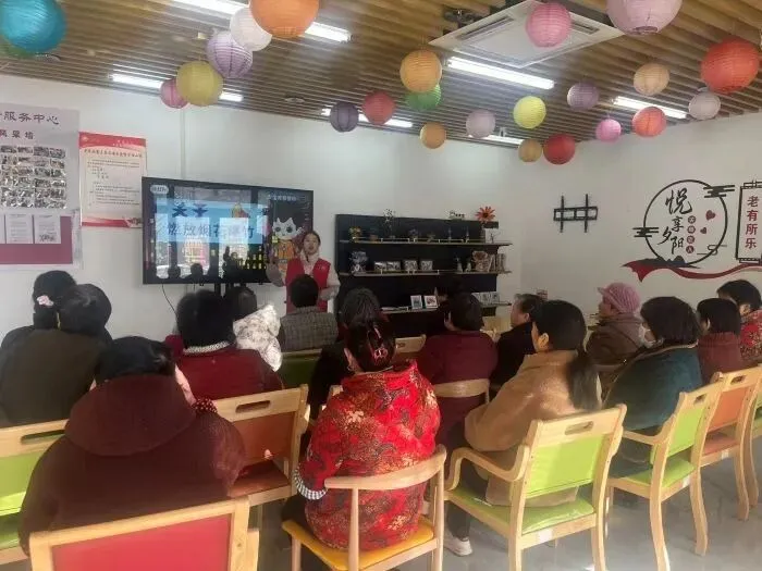 与前面几个中心热闹喜庆的氛围略有不同,甘村的活动室里,气氛认真而专注。这里正在进行一场“筑牢反诈防线安享幸福晚年”的反诈专题宣传活动。二十多位老人坐得端端正正,正聚精会神地看着前方屏幕上的案例视频。社工小郑结合视频内容,用当地方言,以拉家常般的口吻,剖析着“保健品骗局”“高息理财陷阱”“冒充子女亲友求助”等针对老年人常见诈骗手法的特点与破绽。