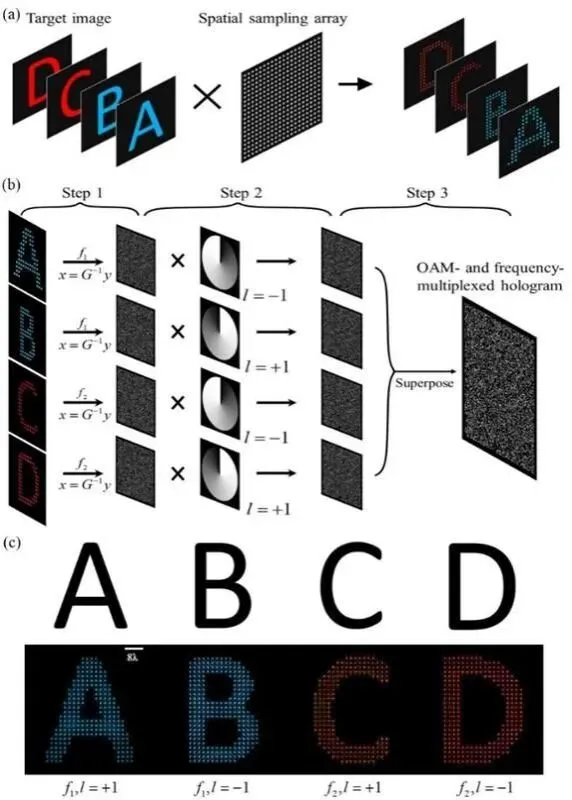 图2 (a)对目标图像进行空间采样;(b)计算具有轨道角动量与频率选择性的声全息图的流程示意图;(c)目标图像(上)与重构的全息图像(下)。