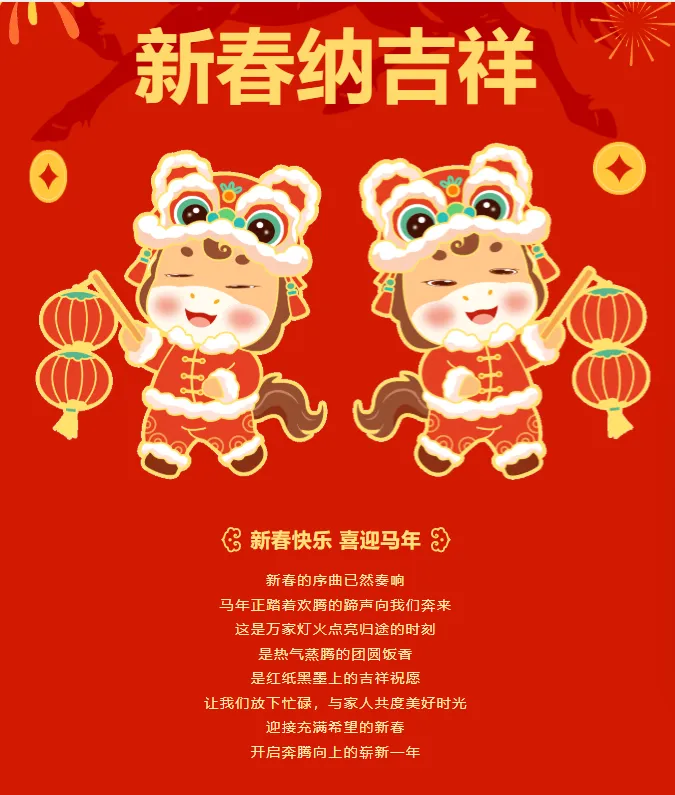金马腾跃辞旧岁,欢歌笑语贺新春。从市井巷陌的张灯结彩到千家万户的团团圆圆,从贴春联、剪窗花的传统雅趣到守岁祈福、互道安康的温情时刻,每一处细节都浸润着新春的喜悦,每一声祝福都承载着心底的期盼。