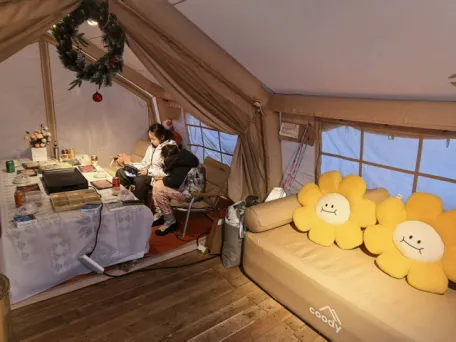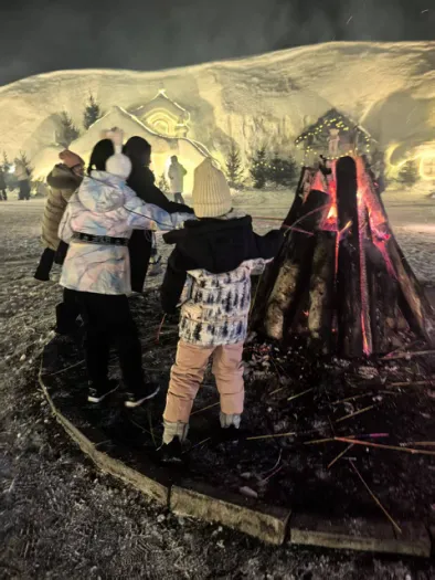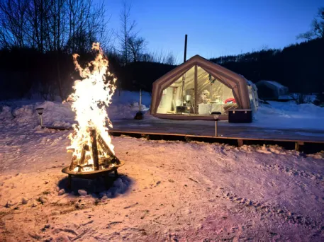 除此外还可以定霍比特雪屋火锅或帐篷烤肉。第一班到达时,屋外可以拍到夕阳下的长白山,很美。建议选帐篷烤肉(比雪屋火锅贵100元每人),因为比雪屋烧烤暖和,距离雪屋也近,6点多可以送去看雪屋、看6:30的烟花,很值得!雪屋及帐篷区有篝火,有布置,非常适合拍照。除了贵,没毛病!