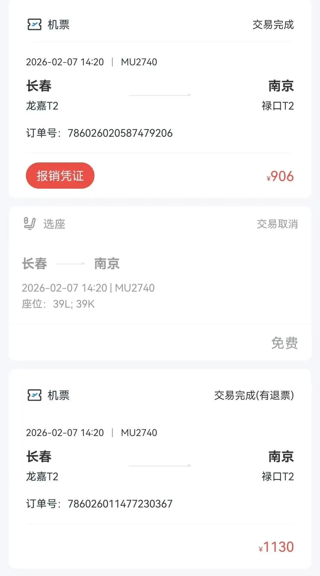 此次行程,来回都是东航,机票价格都很美好。去程,南京飞沈阳,一大一小1364元。回程,长春飞南京,一大一小906元。