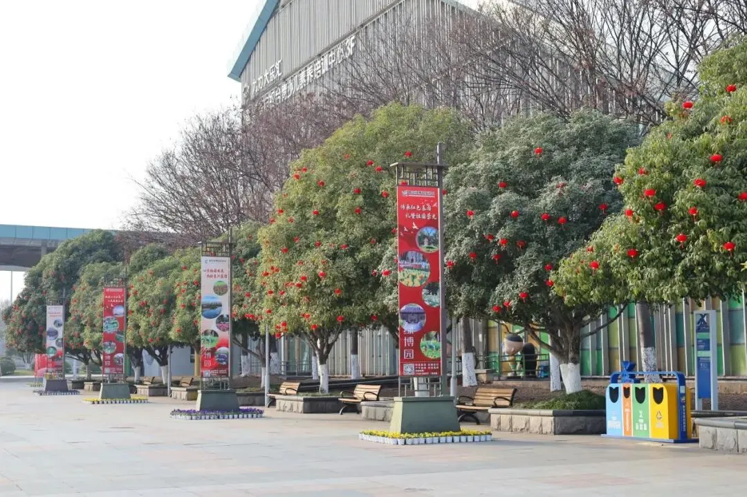 走进绿博园,远远就能瞧见路灯齐刷刷换上了新装!红彤彤的灯笼暖融融的绒面在冬阳下泛着细碎的光,把整条道路都染上了红火。