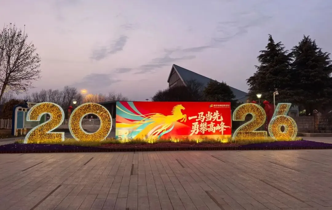 夜幕四合,“2026”字样灯饰璨然点亮;广告牌上,骏马踏祥云而来,捎来一句马年祝愿——愿每一位热爱生活的你,一马当先,勇攀高峰!