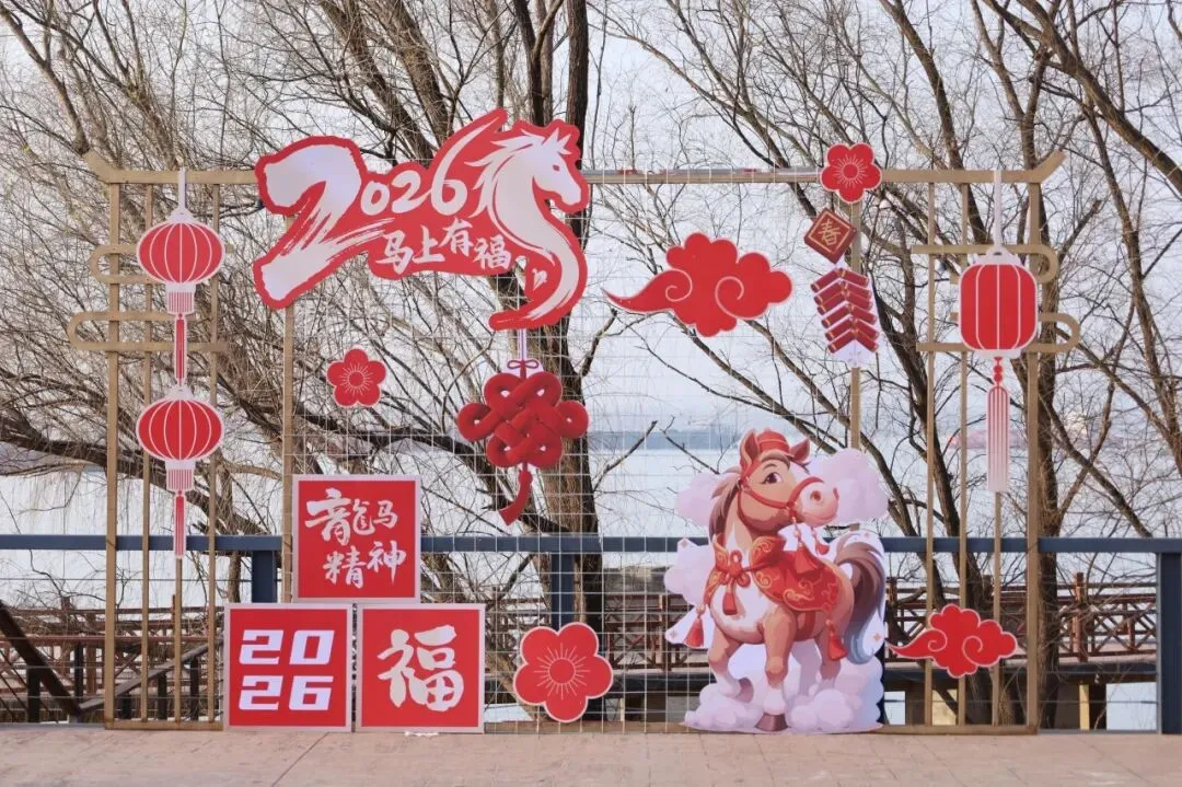 今年,鱼嘴公园可是藏着惊喜!“马上有福”打卡相框俏皮亮相,憨态可掬的小马装置与新春小品相映成趣。