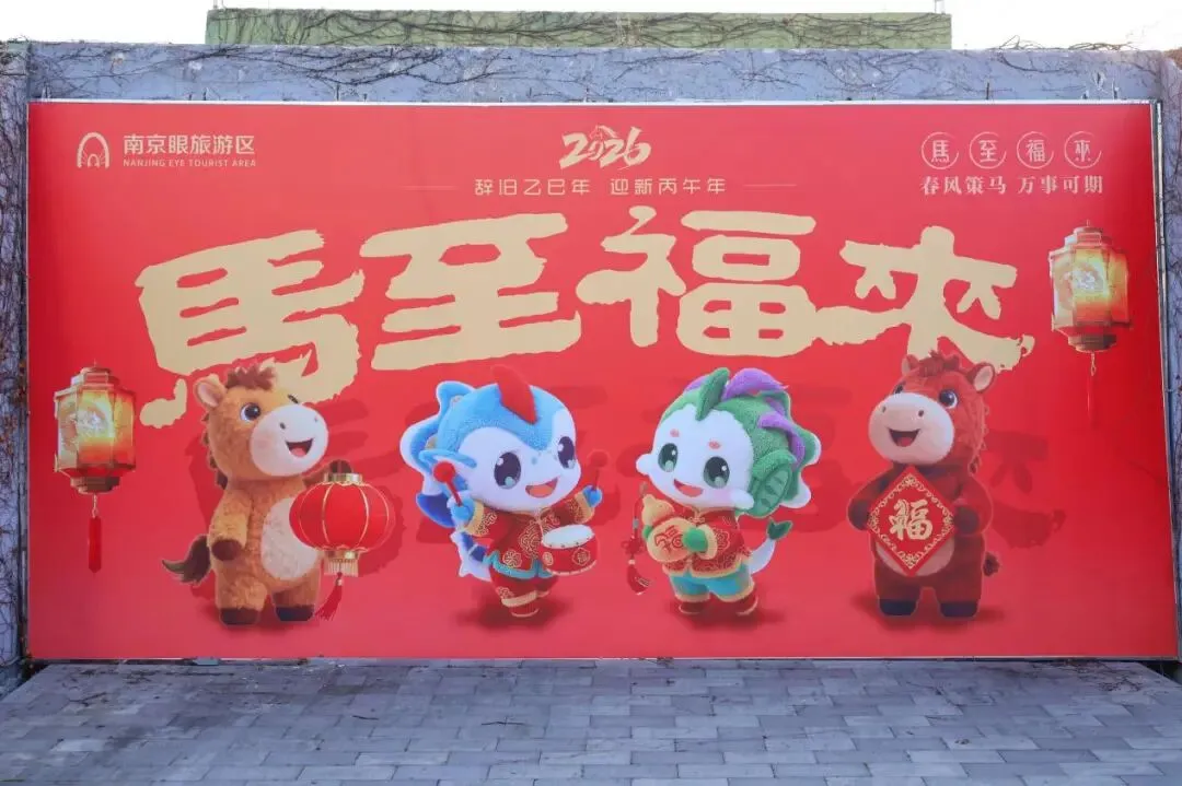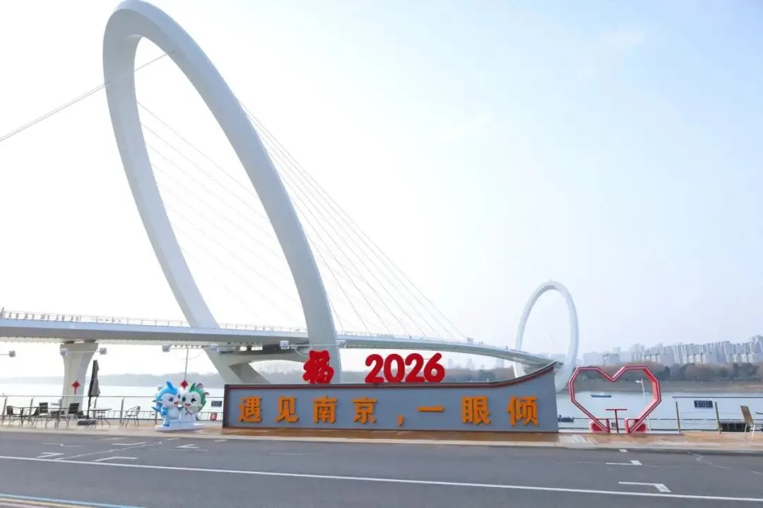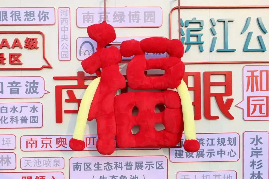 江边的“遇见南京,一眼倾心”标语旁,毛茸茸的“2026”和“福”字安静倚靠着,指尖触上去,都是暖意。