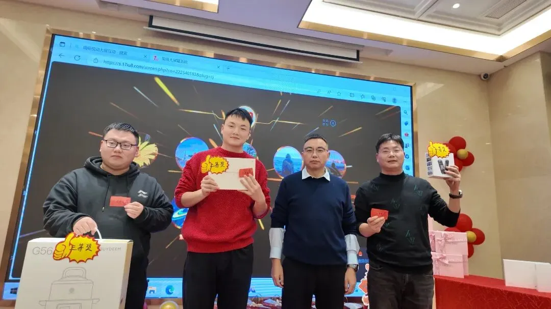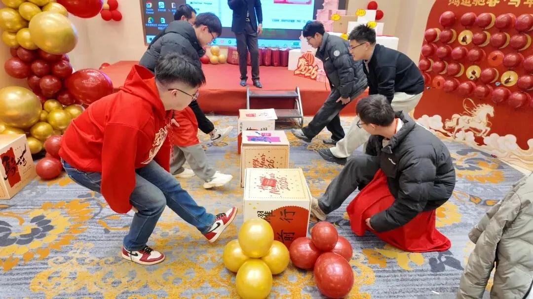 随着各项环节的有序推进,年会正式进入狂欢时刻!来自项目一线的年轻人率先登场,带来节目表演《阳光彩虹小白马》。三人合唱《老男孩》更是瞬间点燃了全场。除了精彩的节目,年会现场还设置了趣味十足的互动游戏环节——“专注搞钱”“团团圆圆”。游戏过程中,员工踊跃参与、默契配合,时而欢声笑语、时而凝神聚力,褪去了工作的疲惫,尽情享受着团聚的欢乐。2026年,行业依然在“艰难”的底色中前行,但九通始终在制造一缕丝的韧性与厚度中,找寻自己的坐标,每一次地基的夯实,都是为了建筑能屹立百年,每一年的耕耘,都是为了九通更长远的发展。2026年,我们将继续承载着希望与梦想,带着这份欢乐与力量,秉持“以品质占市场,以信誉促发展”的理念,踏新程、勇担当,骋万里、启新章,继续深耕基建主业、拓展发展新局,在国内外基建舞台上奋勇前行。