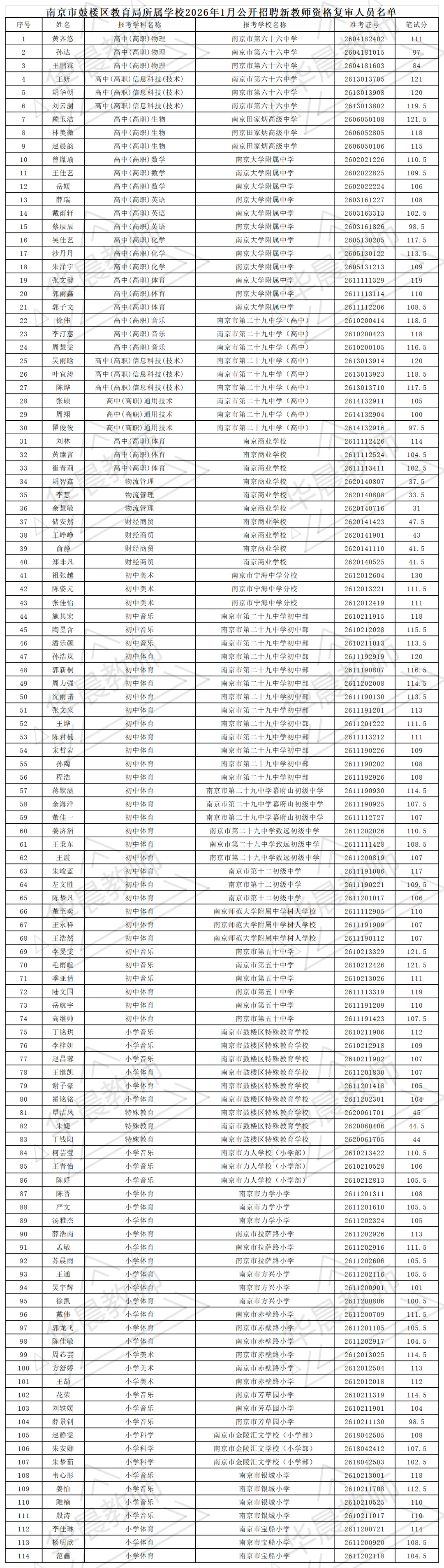 根据《南京市鼓楼区教育局所属学校2026年1月公开招聘新教师公告》精神,经报名和笔试,根据招聘岗位数的1:3,按笔试成绩由高到低,现将资格复审人员名单和相关工作公布如下: