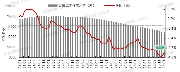 中指研究院数据显示,1月百城二手住宅均价为1.29万元/平方米,环比下跌0.85%,跌幅较上月收窄0.12个百分点。分梯队看,1月,一线、二线及三四线城市二手住宅价格环比分别下跌1.14%、0.87%、0.73%,环比跌幅较上月均有所收窄。