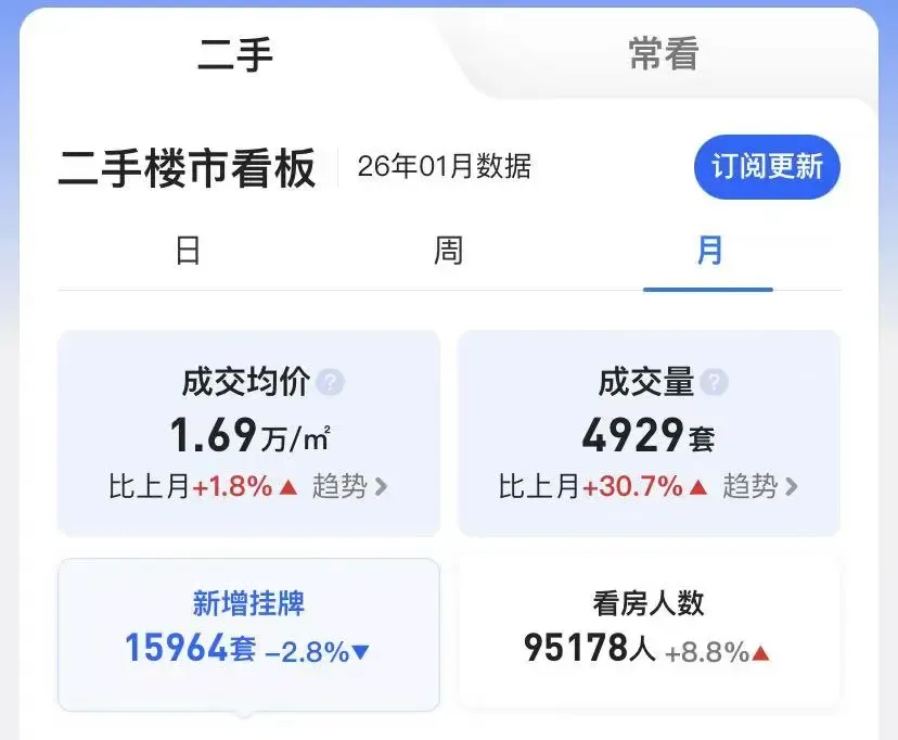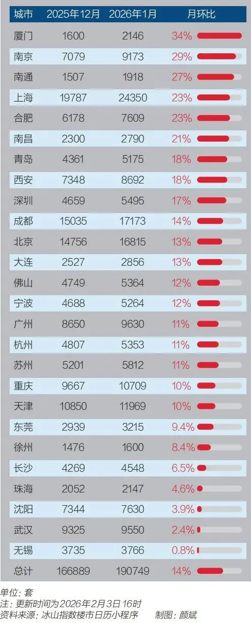 体现二手房市场表现的“冰山指数”显示,2026年1月,其观测的26个重点城市实时成交环比上涨14%,其中以厦门环比增幅最大,达34%。实时成交指的是下定金量,这个数据早于网签。