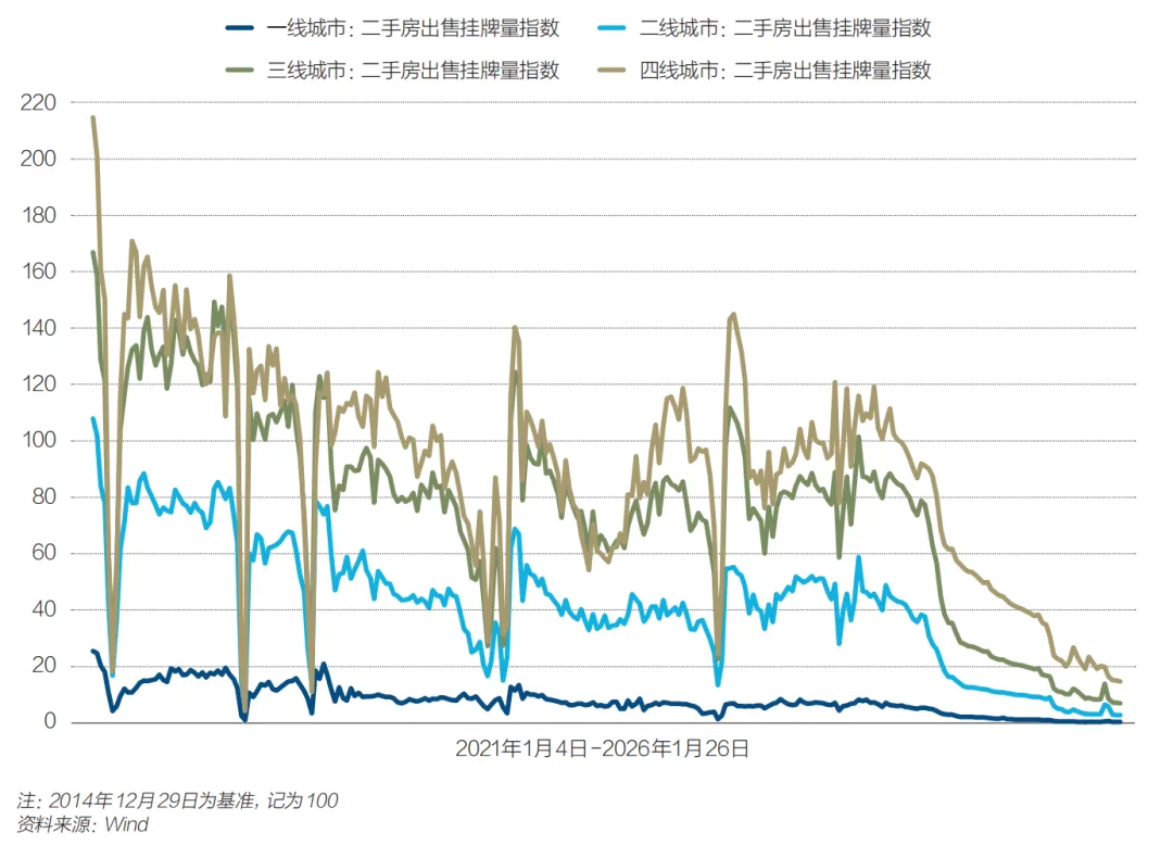 另外值得注意的是,整个1月,全国二手房新增挂牌量也都呈现显著下降趋势。