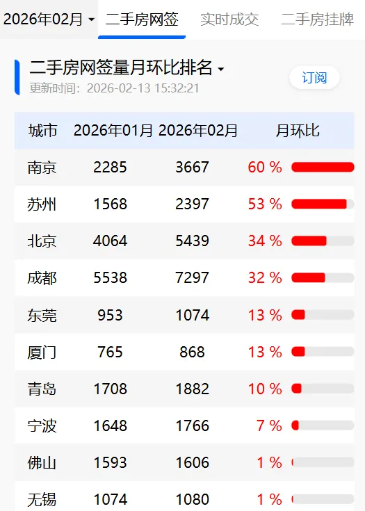 根据数据显示,截至2月13日,南京当月二手房网签3667套,环比1月份上涨60%,涨幅力压众多城市,位居全国第一!