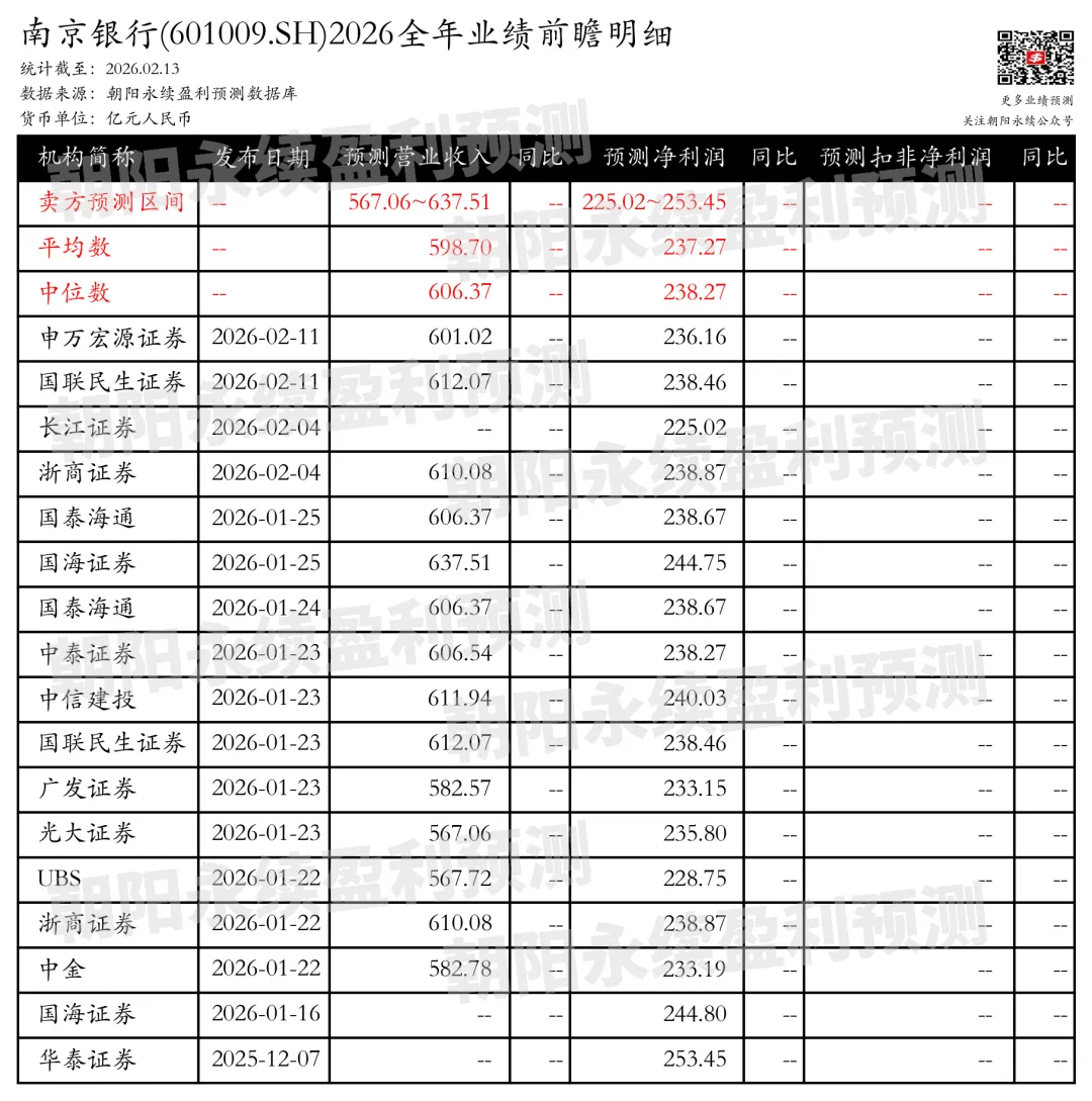 国海证券认为:南京银行2025年业绩快报显示,公司营收和归母净利润均实现同比增长,其中营收预计增长10.48%,归母净利润增长8.08%。第四季度单季度营收和归母净利润同比分别增长16.0%和8.2%。资产总额突破3万亿元,对公板块客户拓展速度接近20%,资产规模同比增长16.63%,贷款同比增长13.37%。利息净收入同比增长超过30%,净利差保持平稳。公司承销业务领先,零售AUM同比增长21.23%,私人银行客户金融资产同比增长22.94%。分业务来说:1)对公板块客户拓展:客户拓展速度接近20%,对公贷款规模站稳1万亿,价值客户数较上年末增长19.04%。2)利息净收入:实现30%以上的同比增长,达到349.02亿元。3)承销业务:非金融企业债务融资工具全年承销规模2713.50亿元,江苏省内市场份额连续八年稳居首位。4)零售AUM增长:零售客户金融资产同比增长21.23%,私人银行客户金融资产同比增长22.94%。浙商证券认为:南京银行在经营管理上展现出新动能,业绩增速有望维持上市银行前列,ROE预计进入上升通道。市场对南京银行业绩增速的担忧被认为过度,实际上南京银行的规模扩张、净息差企稳、金融投资浮盈厚等因素将支撑其业绩。南京银行的杠杆提升、净息差企稳回升、非息压力好于预期以及管理层的积极作为是其业绩改善的主要驱动力。此外,南京银行的股息率高于行业平均,估值具有吸引力,股东增持行为显示了对公司的信心,交易面支撑力强。预计南京银行2025-2027年归母净利润将保持稳健增长,目标价为16.26元/股,维持“买入”评级。(注:本文内容基于朝阳永续AI技术生成,文中相关盈利预测数据均来自朝阳永续盈利预测数据库)