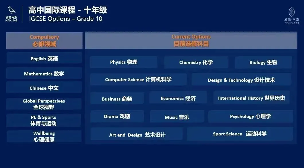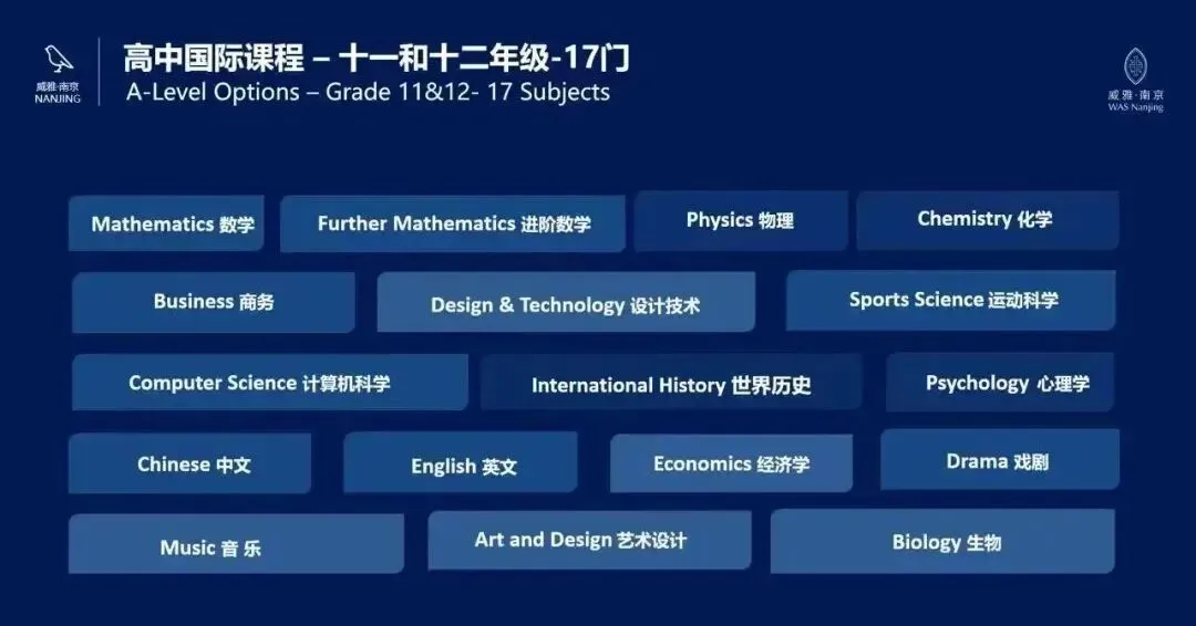 南京威雅学校高中阶段提供经由剑桥国际课程中心和培生爱德思认证的IGCSE和A Level课程,孩子可以自主选择擅长的3至4门科目进行学习、集中精力扬长避短,同时辅以EPQ/HPQ/国际竞赛和一对一升学指导,助力孩子冲击世界前100名校。